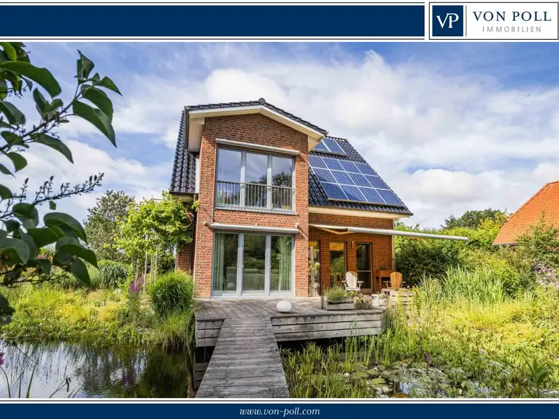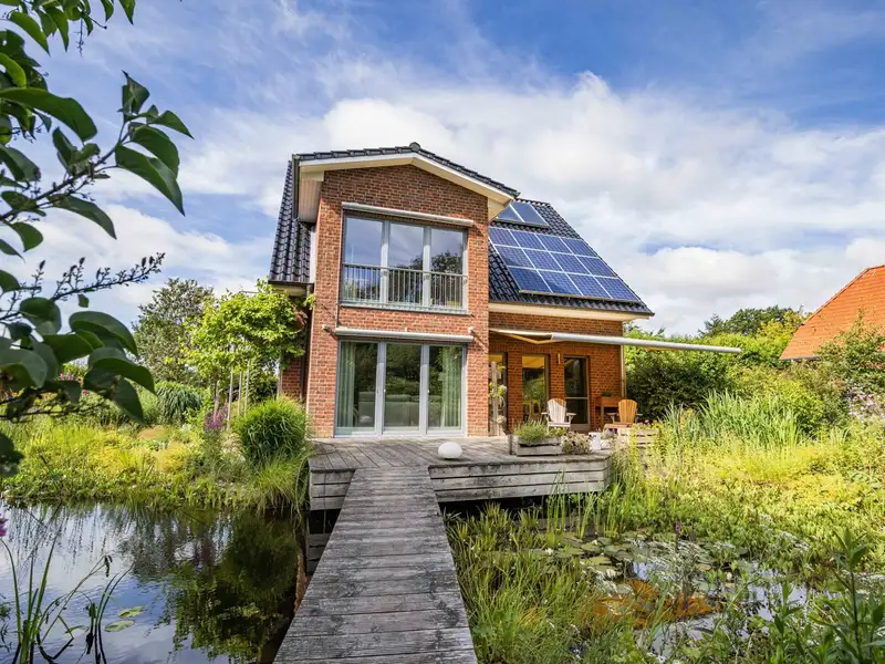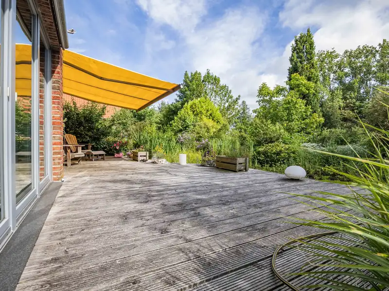 - South-facing terrace with garden pond view