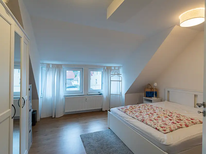 The well-maintained staircase leads to the upper floor, which also has many windows and access to a large balcony spanning the entire width of the house. Hours outdoors can therefore be enjoyed not only in the garden, but also on this attractive outdoor area. The top floor extends the living comfort with a modern layout and living atmosphere.