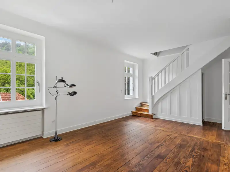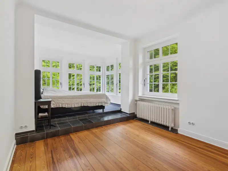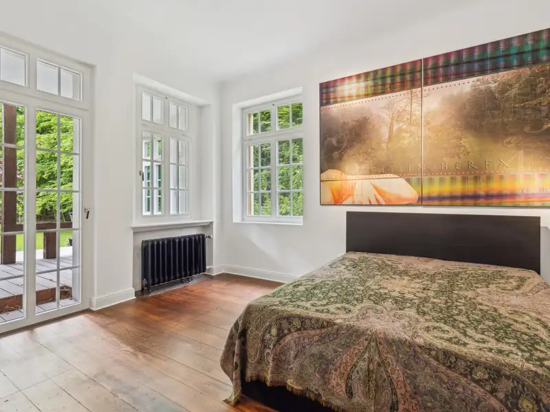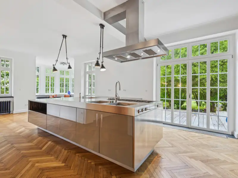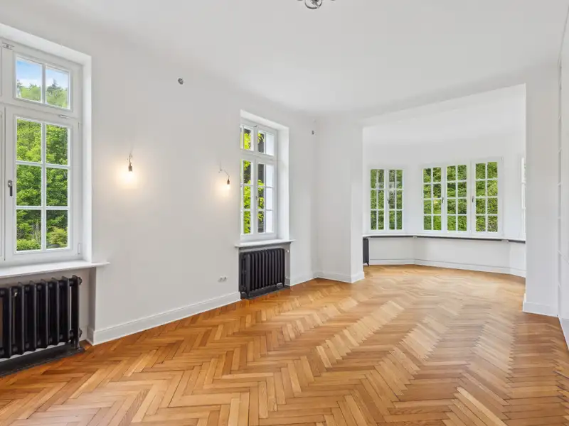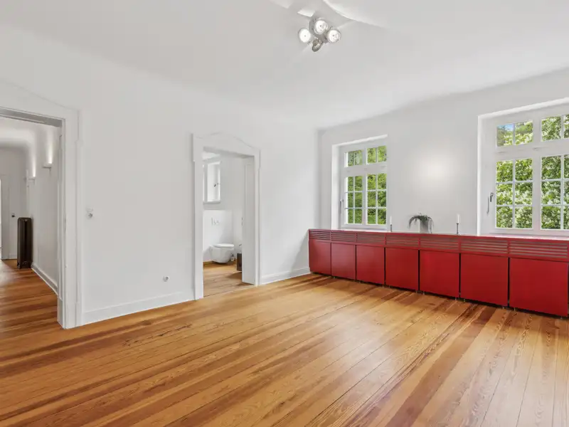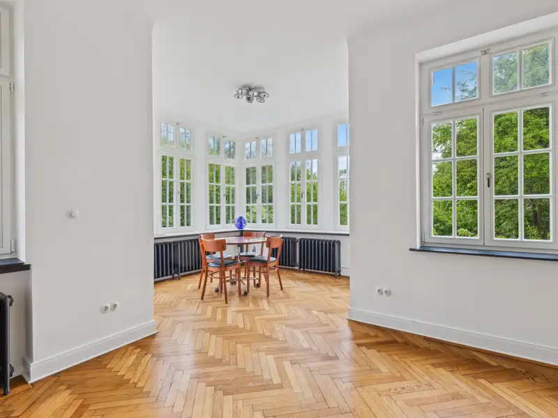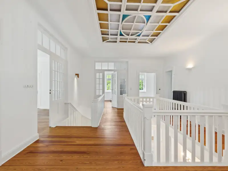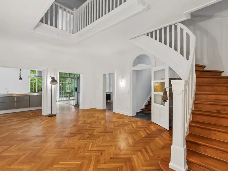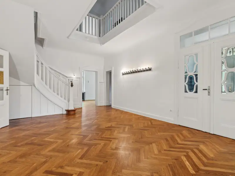 High-quality materials have been used in all areas of the property, ensuring an exclusive finish of the highest standard. The main house impresses with its high ceilings, large window fronts and the warm character of the wooden floors consisting of parquet and floorboards. The generous proportions symbolize a well thought-out and open room concept. The villa is ideal for a large family or as a prestigious residence for discerning buyers. It could also be occupied by two parties, as two staircases connect the individual floors and the living spaces could therefore be divided.