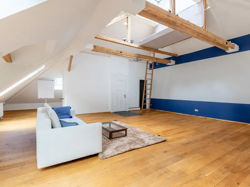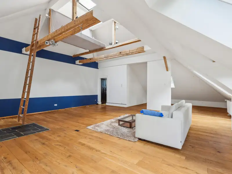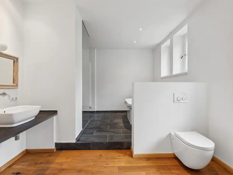 A staircase connects the upper floor with the converted attic. A well-considered room division has created further guest rooms with a guest bathroom, as well as storage or work rooms and a large home cinema.
