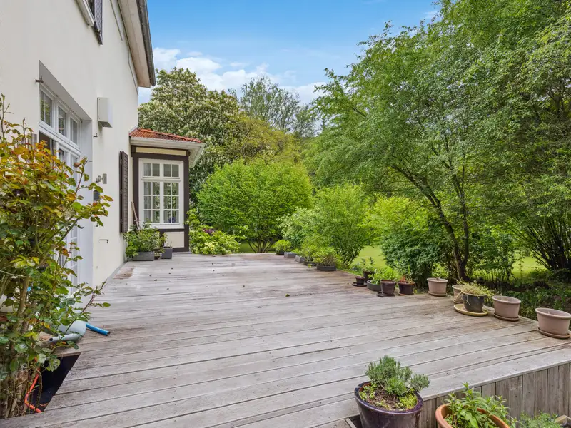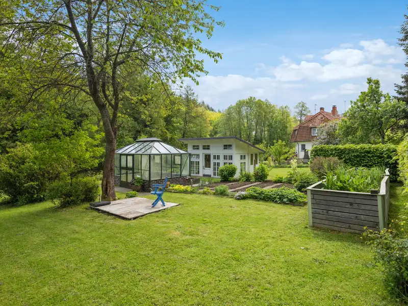 In addition to the main villa, the property offers a coach house, which is most recently used as a double garage. A greenhouse with adjoining vegetable garden makes every gardener's heart beat faster. Naturally, the water supply has also been considered here.
