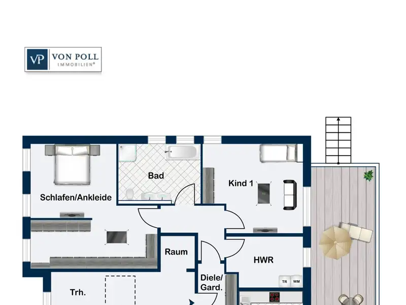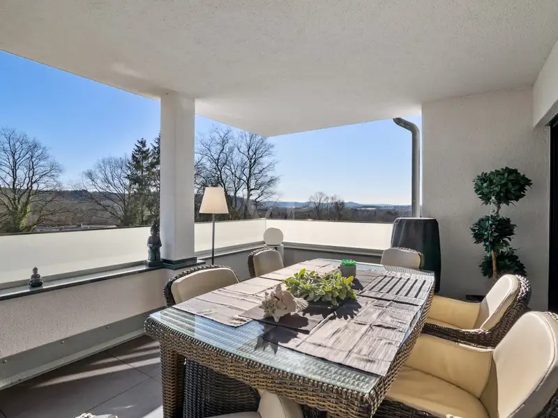 In addition, the adjoining balcony-terrace offers a variety of uses and invites you to enjoy the sun with a picturesque view of the greenery in your free time. Here you can relax and end the day in a peaceful atmosphere.