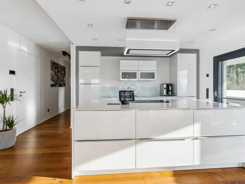 The open-plan, luxurious fitted kitchen is equipped with all modern conveniences and high-quality appliances and meets the highest standards of functionality and design.