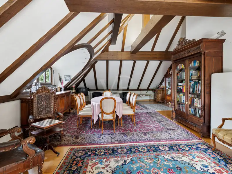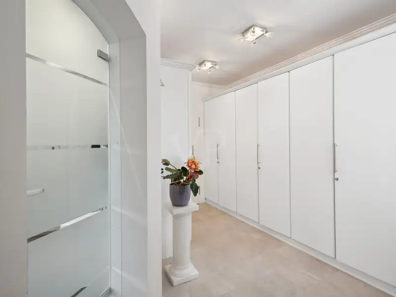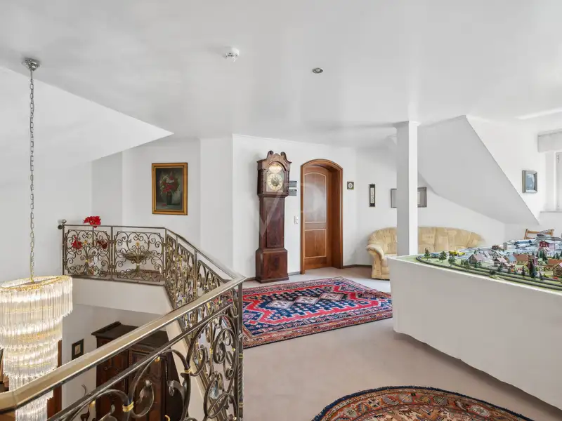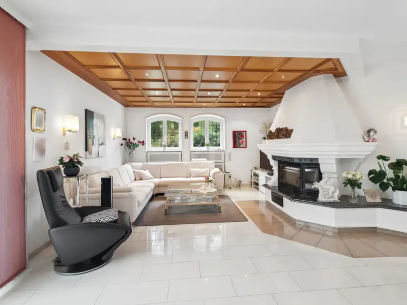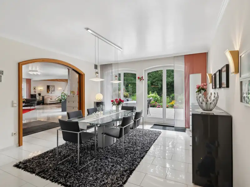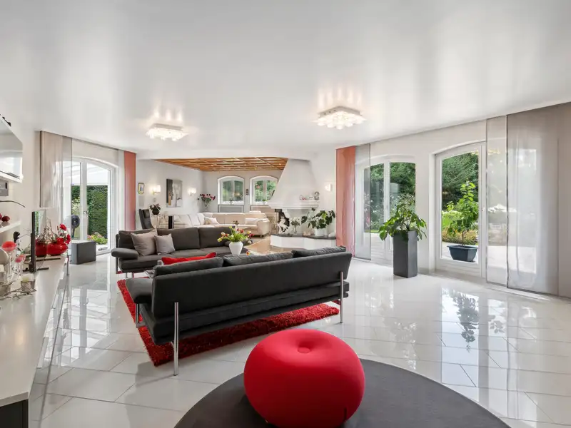 Upon entering this villa, you are greeted by an impressive entrance hall with an elegant marble floor and breathtaking ceiling height. The view of the open gallery enhances the feeling of spaciousness. A custom-made archway leads you into the heart of the property: the impressive living and dining area of approx. 100 m². The open fireplace in the fireplace room provides cozy warmth and contributes to the cozy atmosphere, while large windows offer a harmonious view of the well-tended gardens. An adjoining conservatory blurs the boundaries between inside and outside and provides the perfect place for a relaxed breakfast.