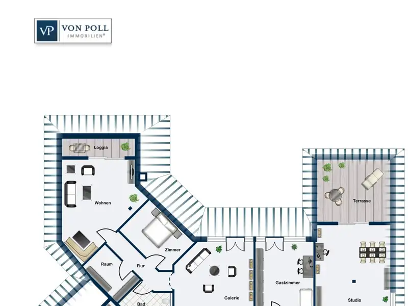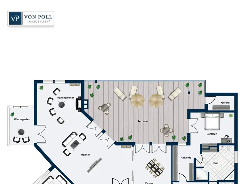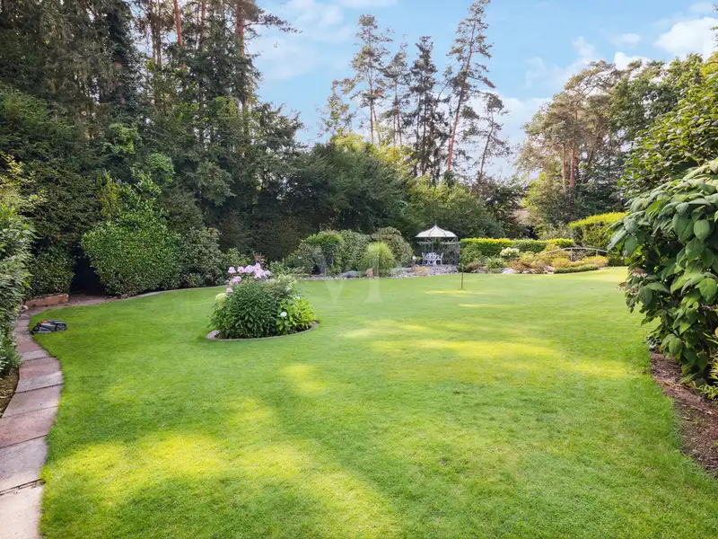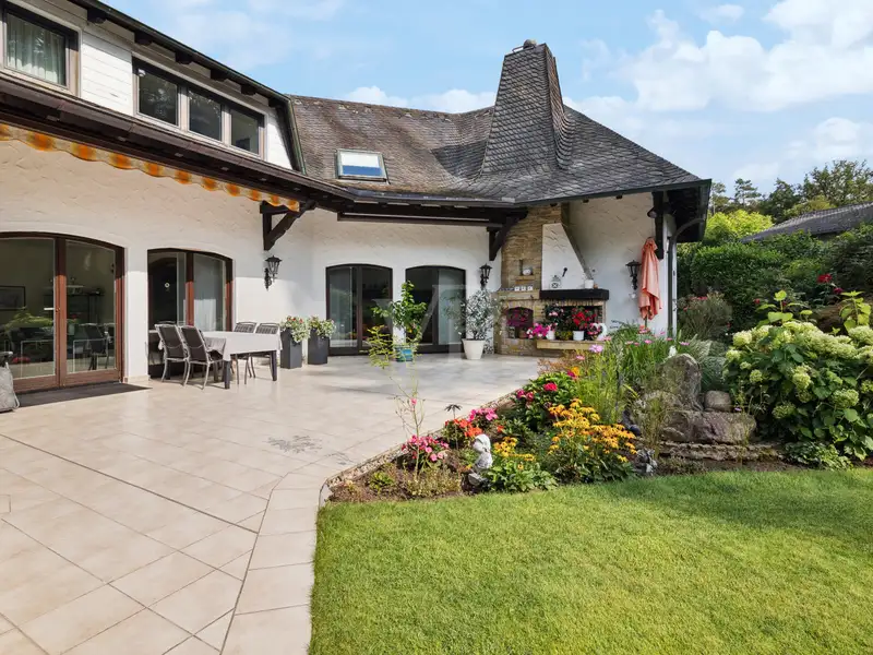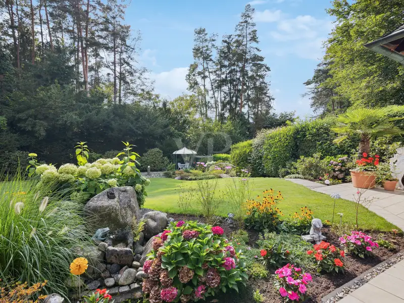 Finally, you can enjoy the view of the idyllic gardens. The immaculately manicured lawn is framed by magnificent panicle and velvet hydrangeas as well as elegant grasses and perennials, which lend the surroundings a harmonious atmosphere. The spacious terrace invites you to linger not only on warm summer days, but also in the cooler seasons, as it is equipped with a cozy outdoor fireplace. This exceptional privacy creates a perfect retreat that invites relaxing moments and real rest.
