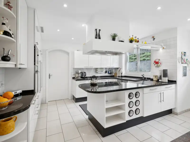 The U-shaped kitchen, which is directly adjacent to the dining area, is equipped with high-quality electrical appliances and features a sophisticated marble worktop, providing the perfect setting for culinary delights.