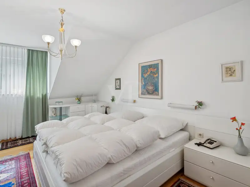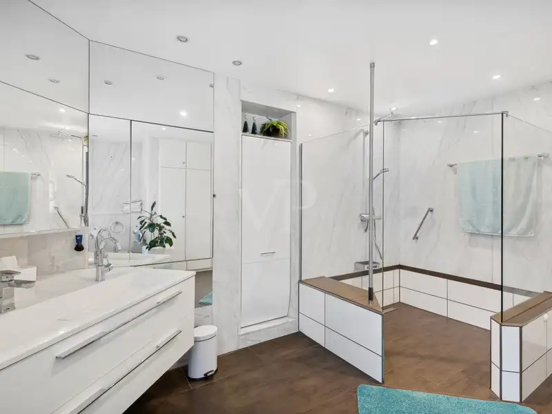 The sleeping area is located separately from the living area as a private retreat. A dressing room leads into this area, which is complemented by a spacious master bathroom with walk-in shower and double washbasin. The bedroom completes this elegant area and offers a comfortable retreat.