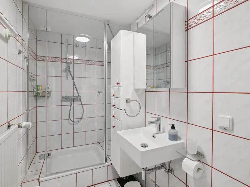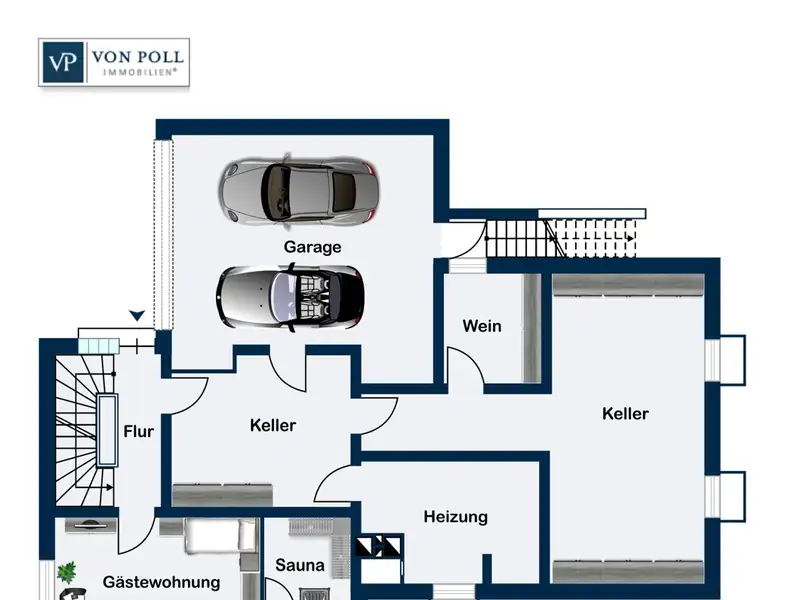 The detached house also has a separately accessible granny apartment on the first floor, which has two rooms, a shower room and a small fitted kitchen. The property also has a partial basement with three cellar rooms on one side and a boiler room with heating oil tanks. There is also a cleaned, decommissioned oil tank in the garden. On the other side there is a separate guest area with sauna, shower room and kitchen connection. The offer is rounded off by a total of three garages - a double garage and a single garage.