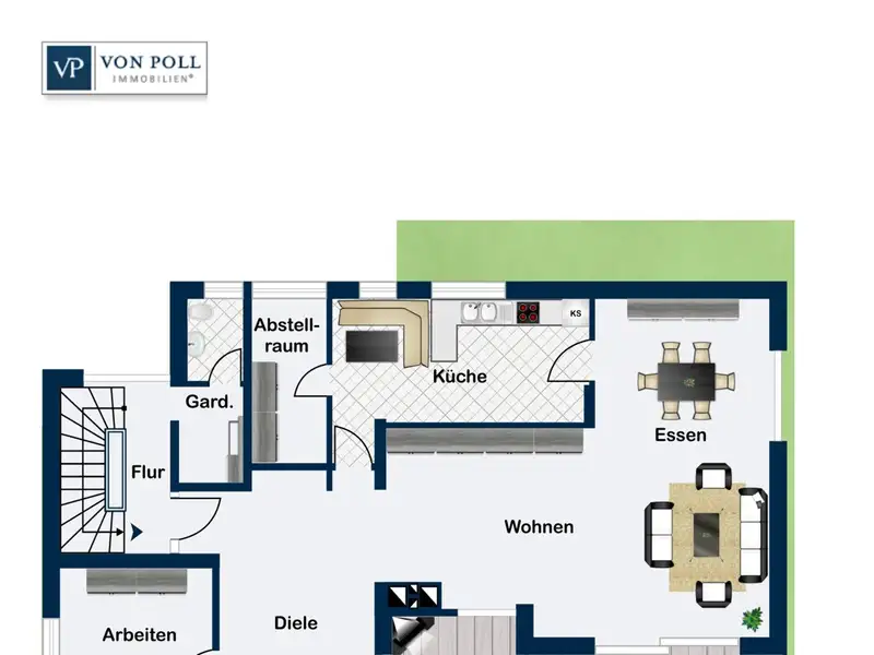 The adjoining kitchen in a timeless beech look blends harmoniously into the living area and, together with the dining area, provides a cozy hub for everyday family life. From there, there is also practical access to a storage room, which creates additional storage space for provisions or household utensils.