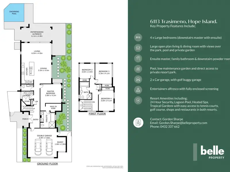 • Ground floor oversized Master bedroom with glamorous ensuite featuring his/her basins, bathtub and shower, walk-in robes and private courtyard.