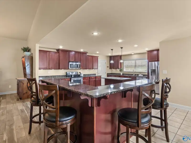 - Chef’s kitchen with island and bar seating