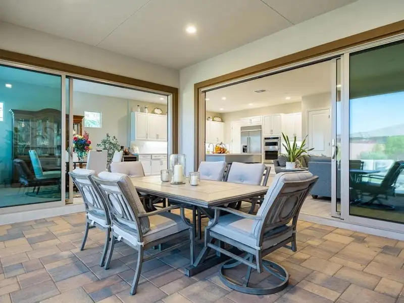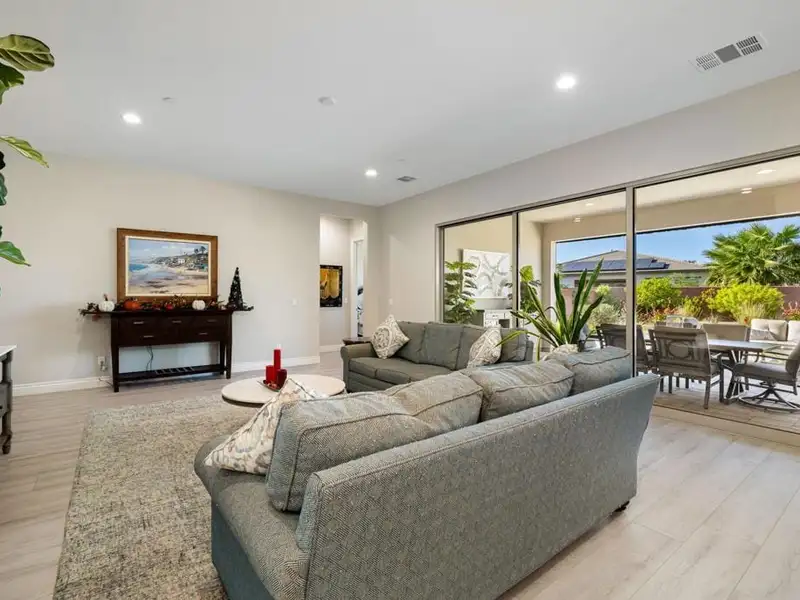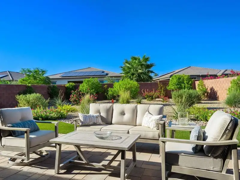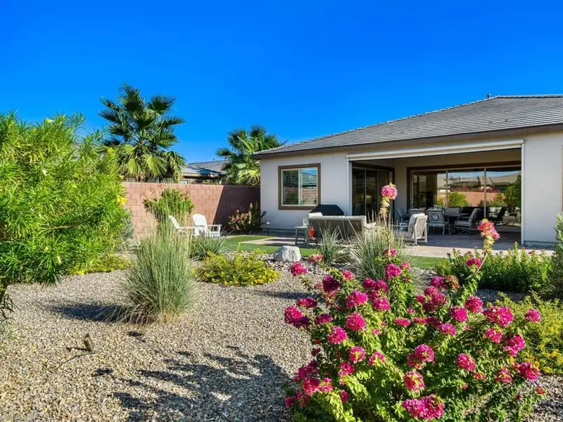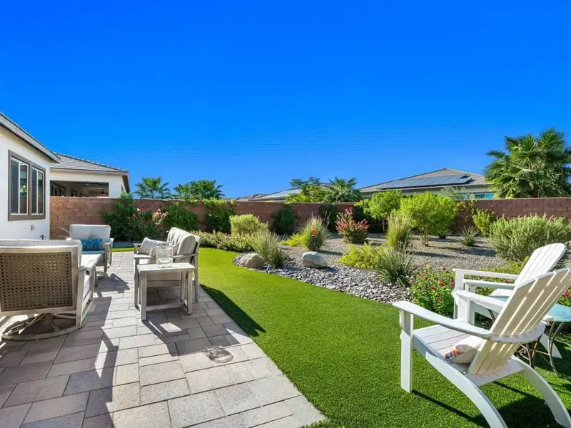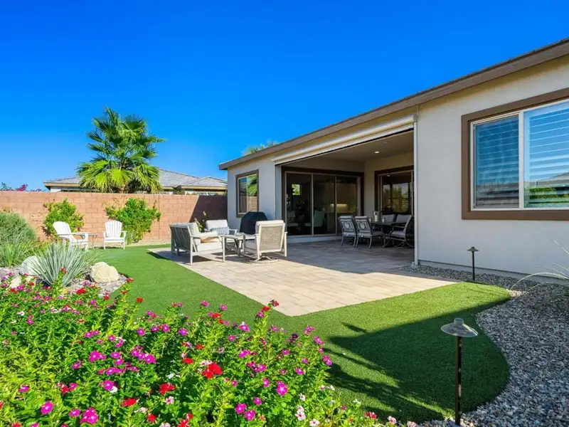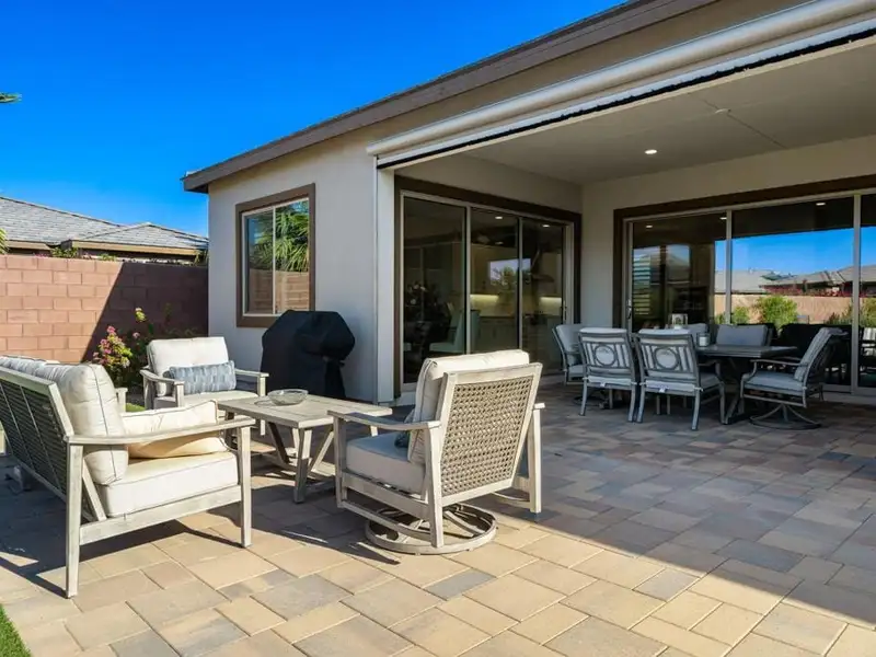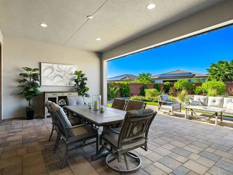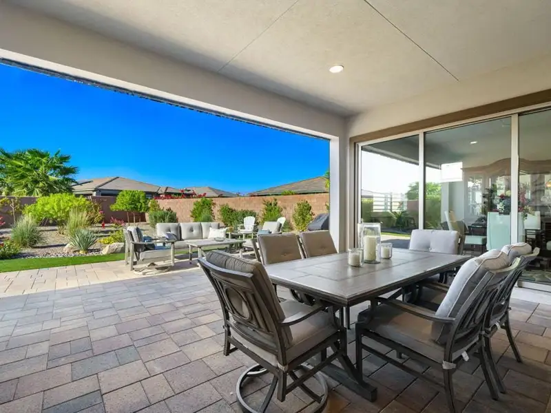Welcome to this impeccably maintained and thoughtfully upgraded Proclaim Plan residence, ideally located behind the private gates of the prestigious Trilogy Polo Club--a premier active lifestyle community. From the moment you arrive, the curb appeal impresses with a beautifully designed paver driveway leading to a custom smoked-glass front entry door, setting the tone for the elegance found within. This spacious and versatile floor plan features a dedicated 3 bedroom, 2.5 bath with den/office that can easily serve as a fourth bedroom, seamlessly flowing into a light-filled great room that exemplifies open-concept living. Soaring ceilings, wide-plank flooring, 5-inch+ baseboards, plantation shutters, and abundant natural light create an ambiance of casual sophistication. Dual sets of pocket sliding glass doors extend the living space outdoors, revealing an expansive covered patio adorned with a paver deck and equipped with drop-down sun/privacy shades--ideal for al fresco dining or entertaining guests in style. The adjacent formal dining area complements the gourmet kitchen, which showcases quartz countertops, a large prep island with bar seating, custom backsplash, ample white cabinetry with brushed nickel hardware, and a suite of high-end stainless steel appliances, including a built-in refrigerator, wall ovens, 6-burner gas cooktop with a custom range hood. The private primary suite serves as a tranquil retreat, featuring a generously sized bedroom, luxurious en suite bath with dual vanities, quartz surfaces, a walk-in closet, and a striking floor-to-ceiling tiled walk-in shower. Multiple guest accommodations provide comfort and privacy for visitors, while a separate laundry room with built-in cabinetry and a utility sink adds convenience. Additional enhancements include 15 solar panels for energy efficiency, a golf cart garage, and professionally designed low-maintenance landscaping that creates a serene outdoor atmosphere. This exceptional home is the epitome of luxury desert living--schedule your private tour today to experience it firsthand.