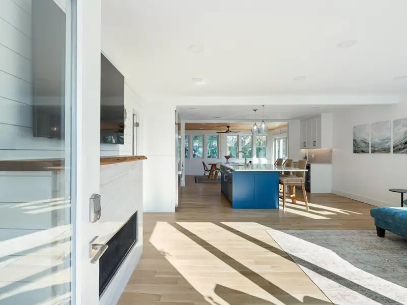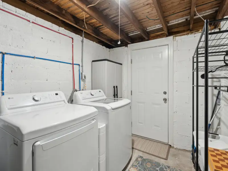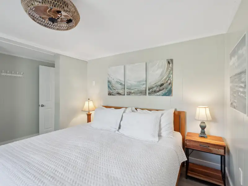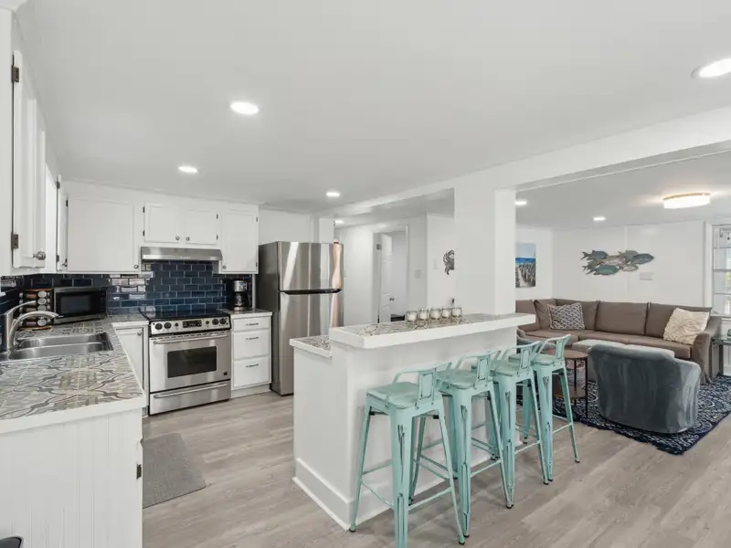 Enter the downstairs unit through a screened porch with outdoor seating and a wall fan to keep you cool on a warm summer day. The large, open living room, dining, and kitchen area are designed for entertaining with plenty of room for seating and a full sized kitchen. Luxury vinyl flooring provides a light and beautiful look that is also easy to care for. Down the hall, there are two large bedrooms that each accommodate king sized beds. One has a reach-in closet and the other has a walk in closet. A full bathroom in the hall is shared. A bonus room for overflow, office, or playroom area provides access to the downstairs laundry and utility storage area. Three exterior doors on the laundry area allow for easy access to bikes and could be divided to provide half to upstairs and half to downstairs units.