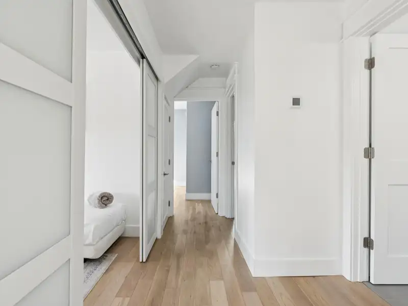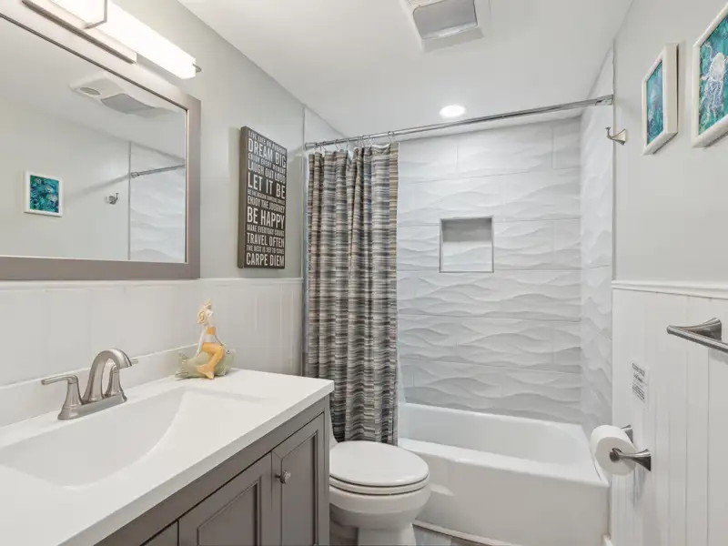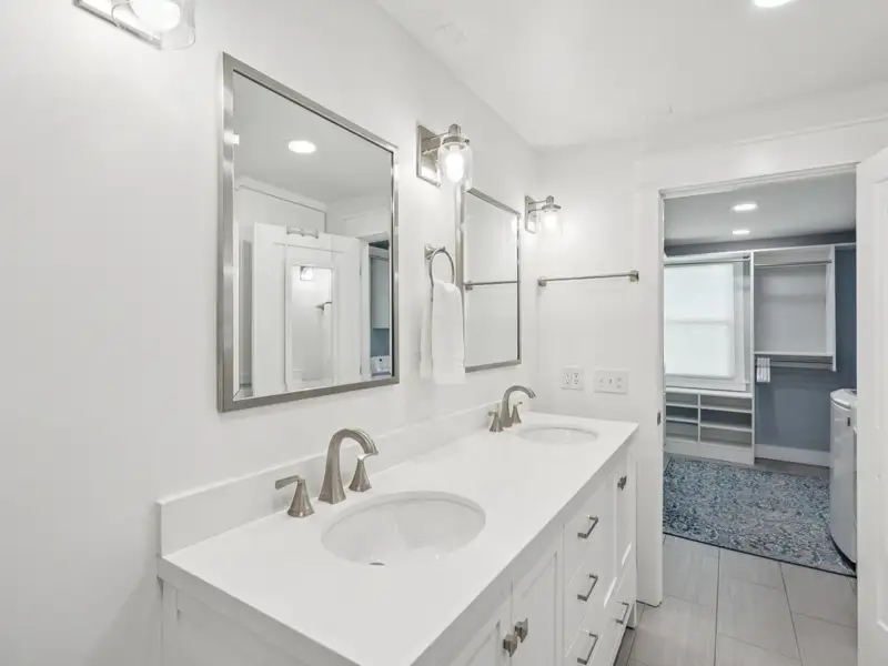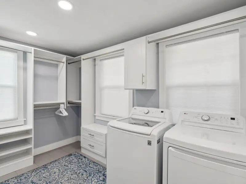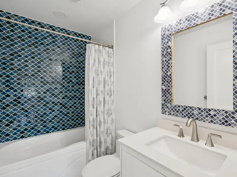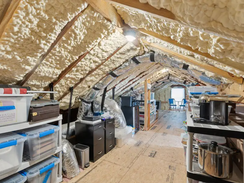 The upstairs primary bedroom is large enough to accommodate a king sized bed and large dresser. A walk in closet with custom organization provides drawers, shelves and racks for clothing storage as well as a full sized washer and dryer. The primary bathroom includes an oversized shower, dual sinks, and custom built closet & drawers. The second bedroom is large enough to accommodate a king sized bed with a reach-in closet for clothing and two windows offering plenty of light. Both bedrooms have custom wood shutters on the windows. Flexible third bedroom/office with exterior doors to the front porch and full sized stairs to extensive attic space, conditioned and insulated for storage, and an additional closet under the stairs. The second upstairs bathroom includes an extra deep soaking tub and mermaid tiles on the back wall.