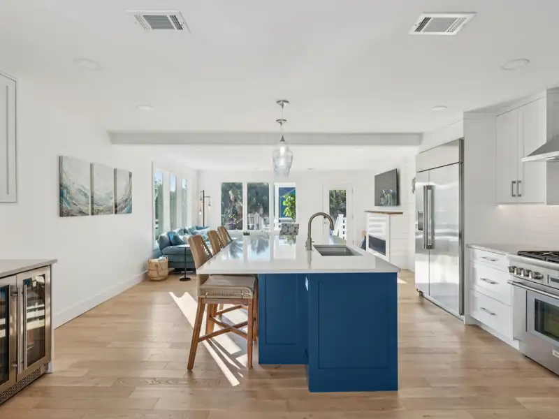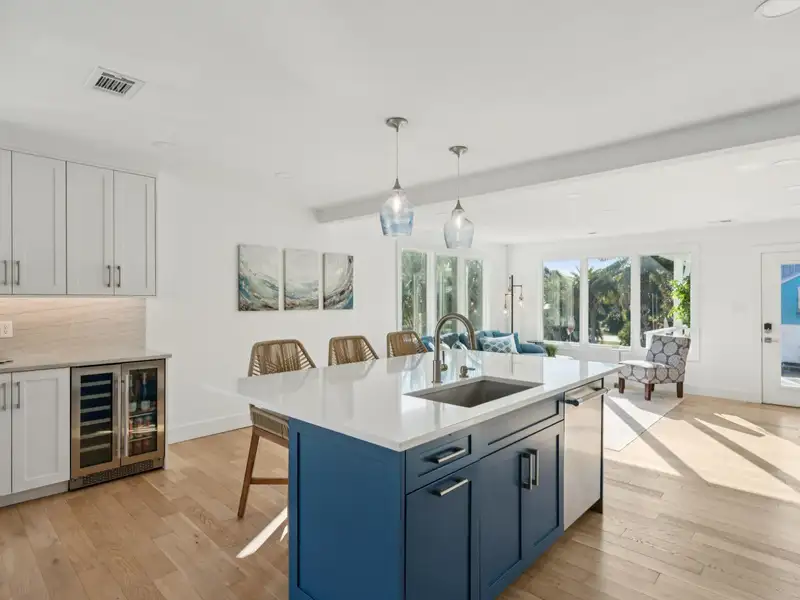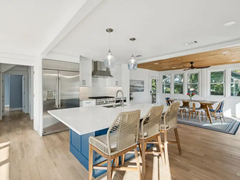 Steps to the Beach! This classic beach house sits on a large corner lot just one block from the 25th Avenue beach access. An original duplex, it has been fully renovated with modern finishes while retaining its island charm. With new roofing, flooring, kitchens, bathrooms, electrical, plumbing, garage, and custom porches, this home is move-in ready with endless potential. Live in one unit and rent the other, create a dedicated guest suite, or convert to a spacious single-family home - the choice is yours! **Note: Listing agent is the seller.**Enter the upstairs unit through the covered front porch with conversational seating as well as an open deck area with views of palm trees in every direction. The upstairs has beautiful new hardwood flooring throughout. The open floor plan and large windows paint the room with natural light and great views of the surrounding trees.The gourmet kitchen is appointed with a professional gas range and vented hood, dishwasher, 42 inch built in refrigerator with filtered water and ice machine, built in microwave drawer with hidden control panel, a large island with sink and seating on three sides and a bar area with under counter beverage refrigerator. Enjoy dining and entertaining in the spacious, treehouse-style dining area surrounded by beautiful views and decorated with a gorgeous natural wood ceiling. Extra large storm resistant sliding glass doors provide access from the dining area to an uncovered deck for grilling and enjoying the sunshine.