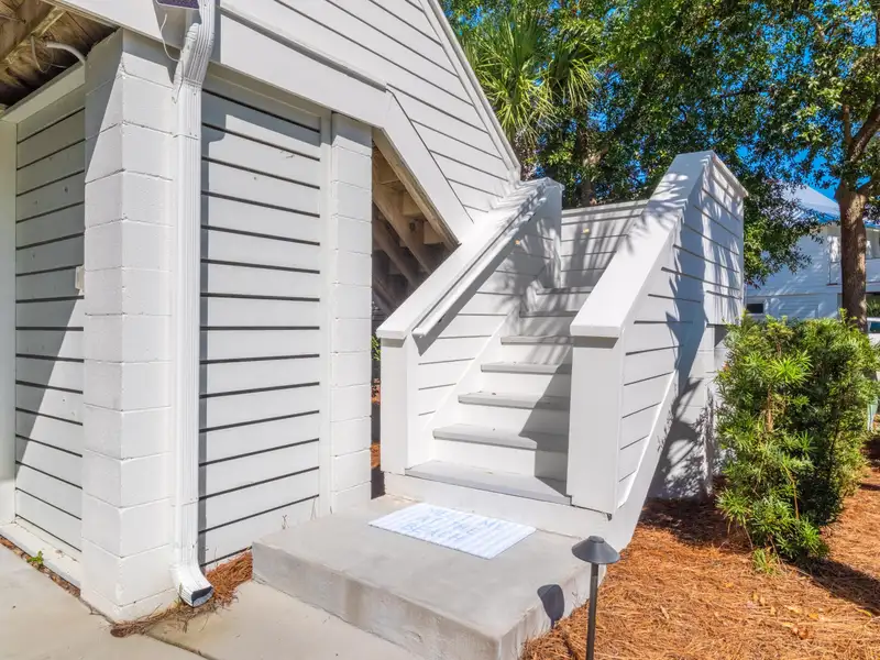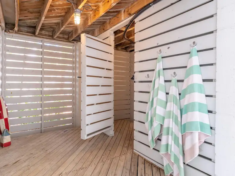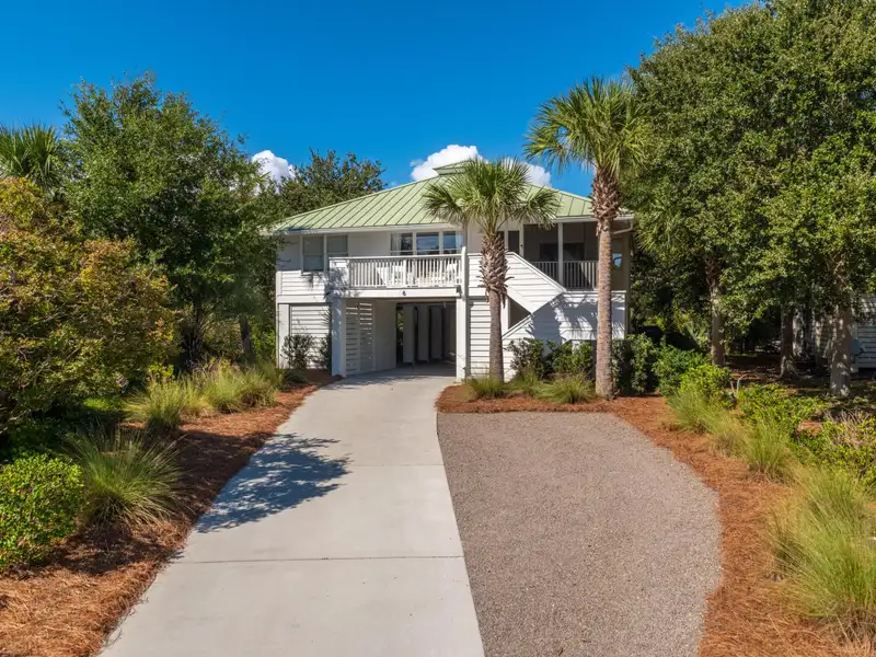The bungalow's drive-under elevated design provides for fun times while awaiting a tropical sprinkle to pass...sitting area, game space, private outdoor shower and multi-storage areas are essential beach house needs. The area offers covered parking for three cars-the maximum amount allowed by the community. The entire under portion and driveway were also recently poured with fresh concrete and wood decking in 2022. Essential coastal elements of metal roof and hardiplank siding complete the exterior.