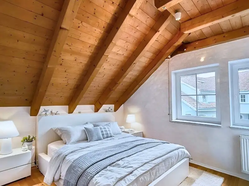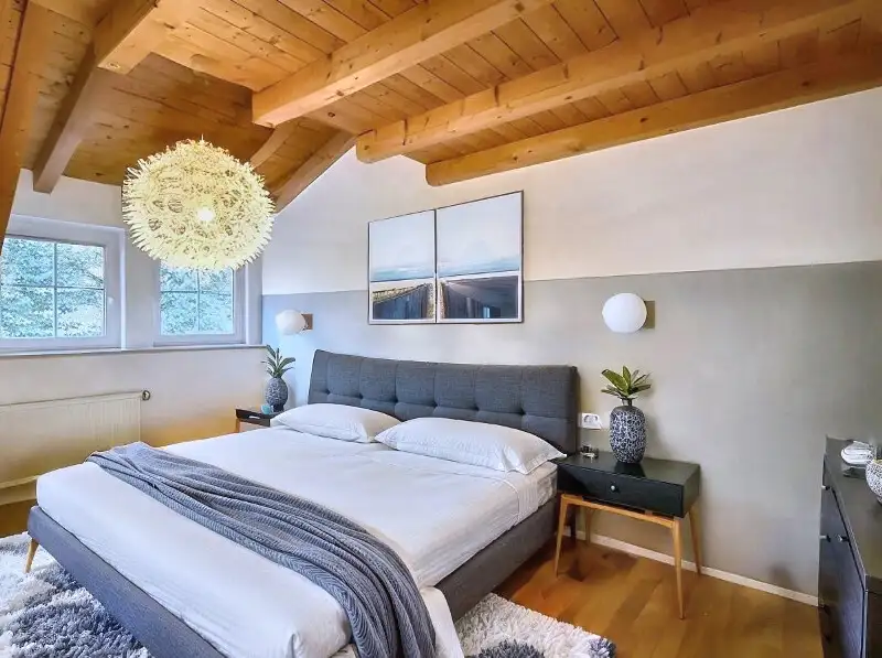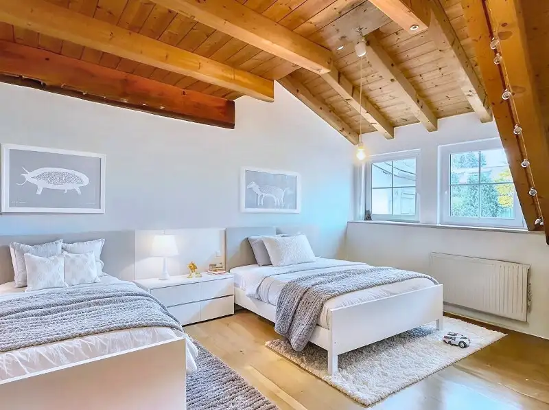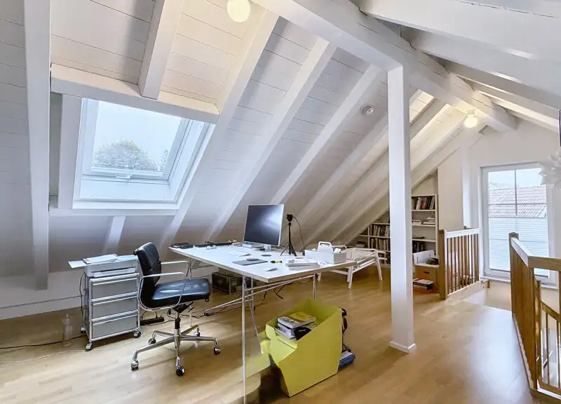 The feeling of spaciousness continues on the upper floor and attic. Visible rafters give the rooms character and a feeling of security under the roof.