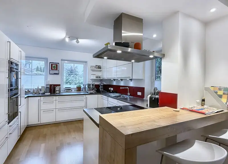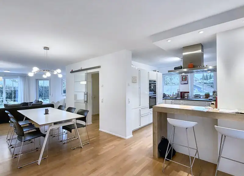 The open-plan living, dining and kitchen area is the heart of this home - a place where family and friends come together to cook, laugh and live. The high-quality, timeless fitted kitchen with Miele dishwasher, Neff induction hob, oven and steam cooker from Siemens and exhaust air system to the outside impresses with its function and design in equal measure.