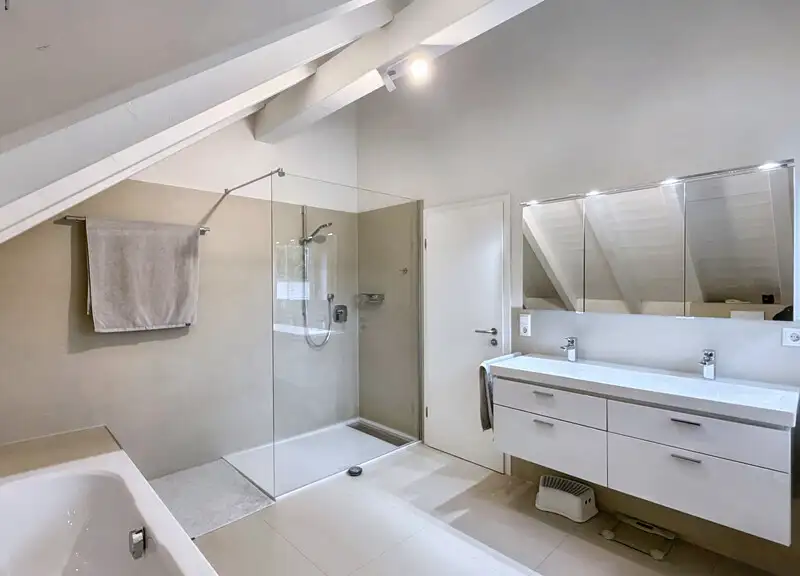 The bathroom is a real highlight: high-quality porcelain stoneware tiles, modern fittings and a clear style create a boutique hotel atmosphere.