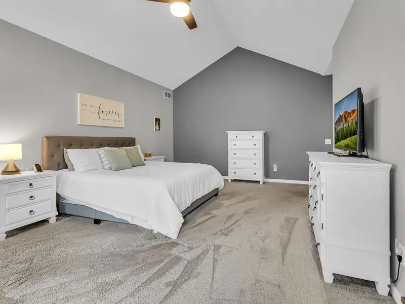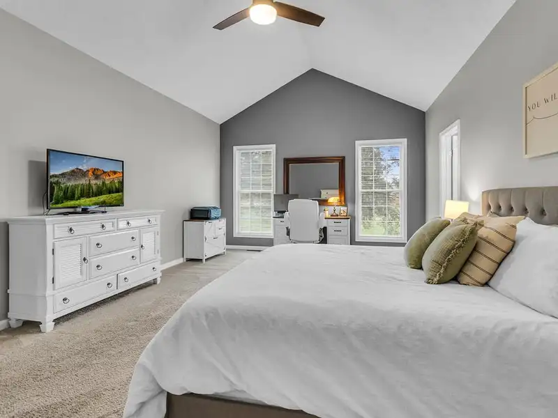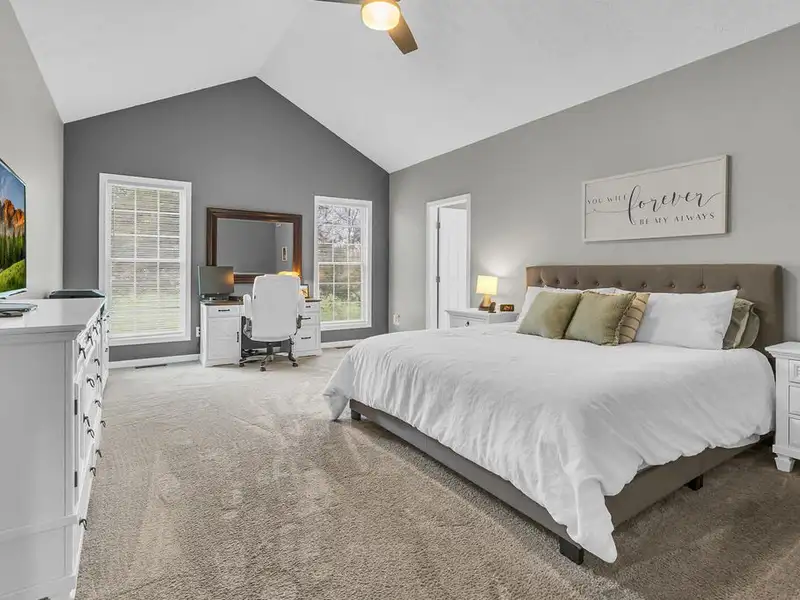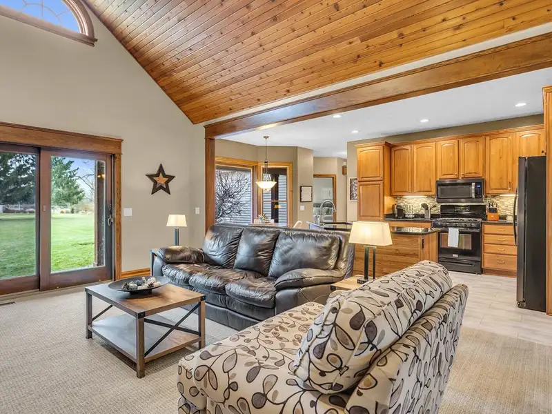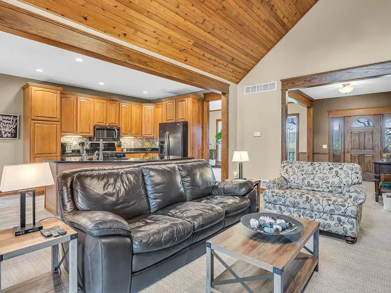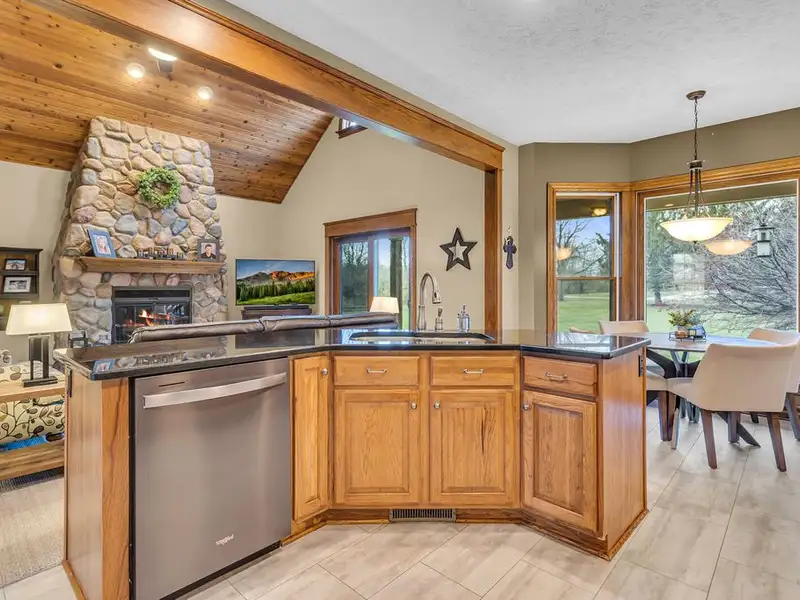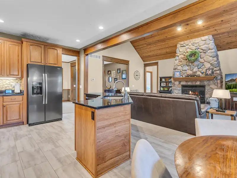 - Vaulted ceiling and wood-burning fieldstone fireplace