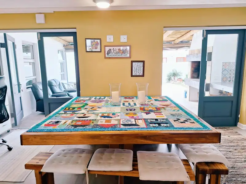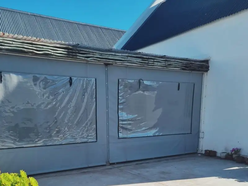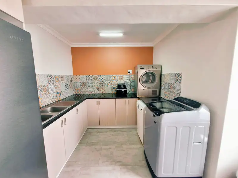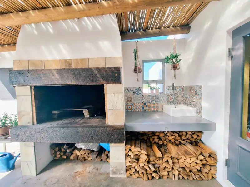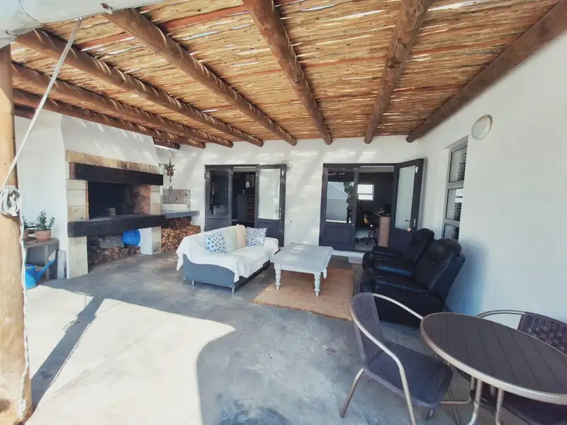 * Two double doors leading from the living area to the covered patio with a built-in braai, basin and roll-down canvases.