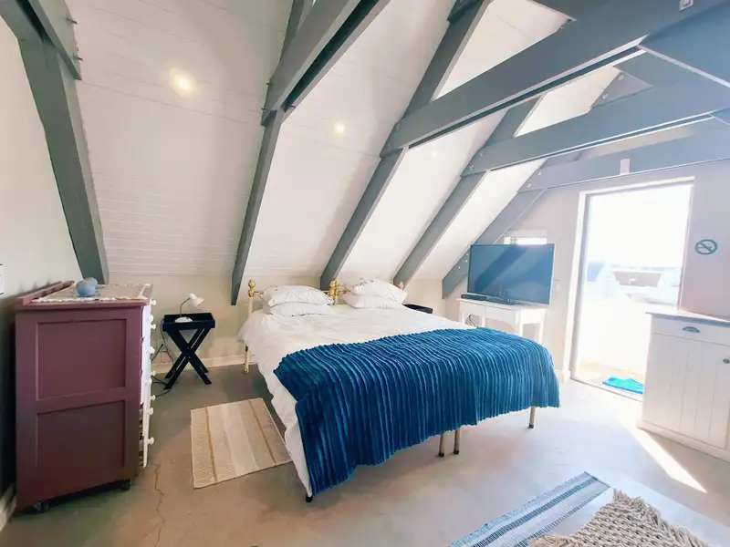 * Main bedroom with built-in cupboards and double door leading to the garden