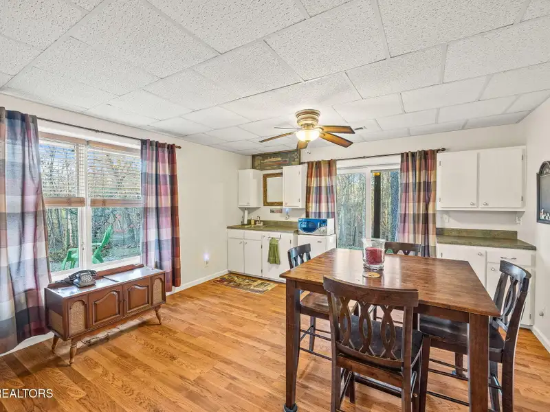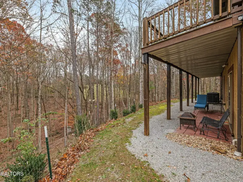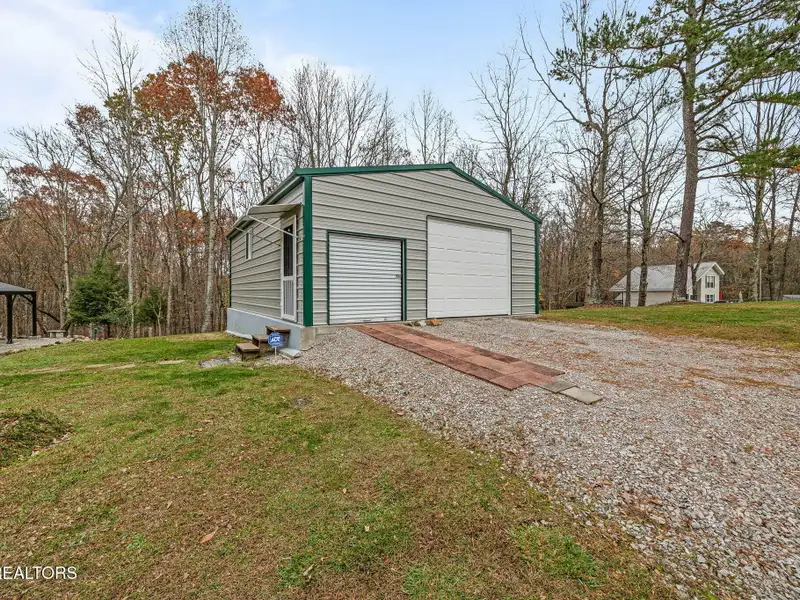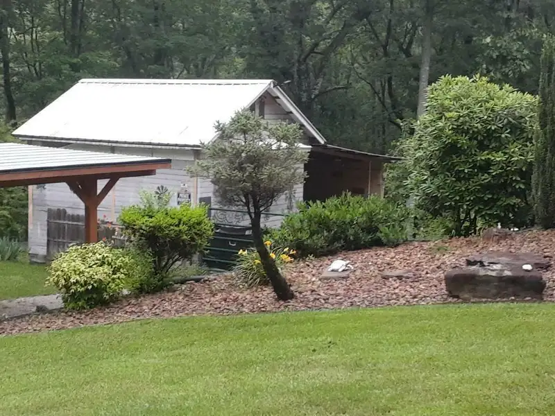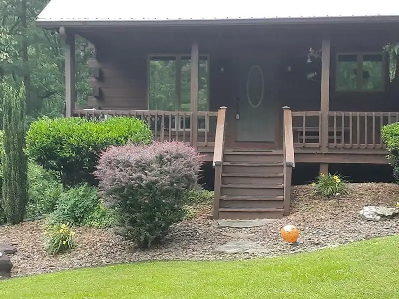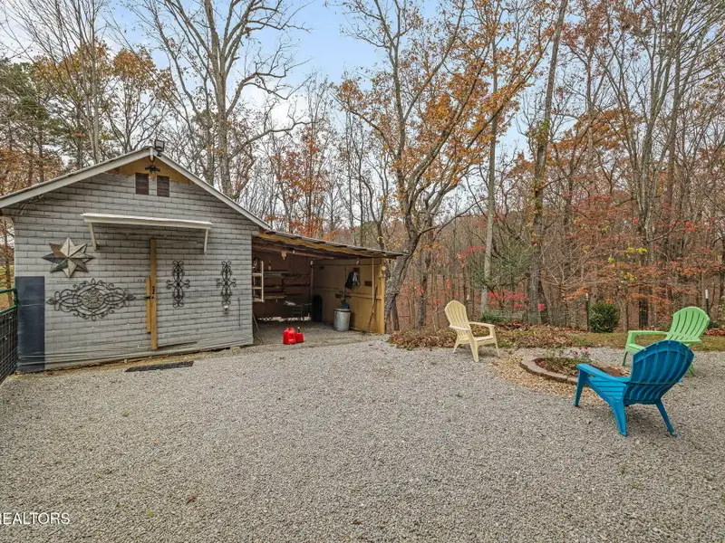 Step outside to discover the serene beauty of the expansive back deck, which offers breathtaking views of wildlife, a charming bluff with natural rock formations, and a peaceful creek running through the property. The yard is beautifully landscaped, blending seamlessly into the surrounding woods, and includes a fire pit for evenings under the stars. The property also features two carports with concrete-anchored pads, a storage shed, and a detached garage with outstanding amenities. The 20'x30' metal building sits on a solid concrete base and boasts insulated walls and ceilings, LED lighting, a natural gas heater with its own independent meter, and a hardwired smoke detector. The garage is equipped with an independent fuse box and electrical meter, as well as 4-gang outlets throughout. It also features two slide-by windows and two doors: one 10'x8' garage door with an opener and remote and a second manually operated roll-up metal door, approximately 6'x6', with a brush seal.