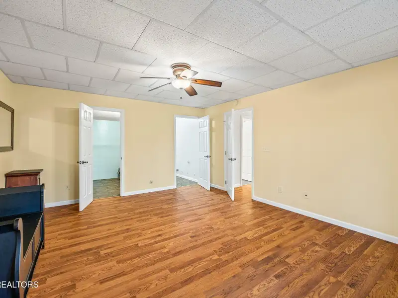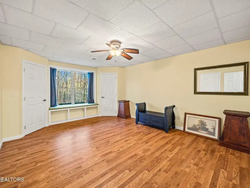 The main level welcomes you with a spacious open floor plan, soaring cathedral ceilings, and a built-in stone fireplace with a remote control, allowing you to set a temperature for the fireplace to automatically turn on/off, perfect for gatherings or quiet evenings. The well-appointed kitchen features plenty of cabinetry, a garbage disposal and a dishwasher, making it ideal for everyday living or entertaining. The main level also includes a sizable primary bedroom with ample closet space, extra insulation underneath the bathroom floor for extra comfort, an additional room with a closet that could function as an office or second bedroom, and large casement windows that flood the space with natural light while showcasing the stunning views of the surrounding landscape.