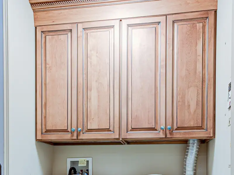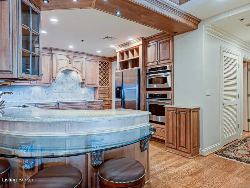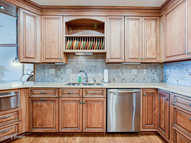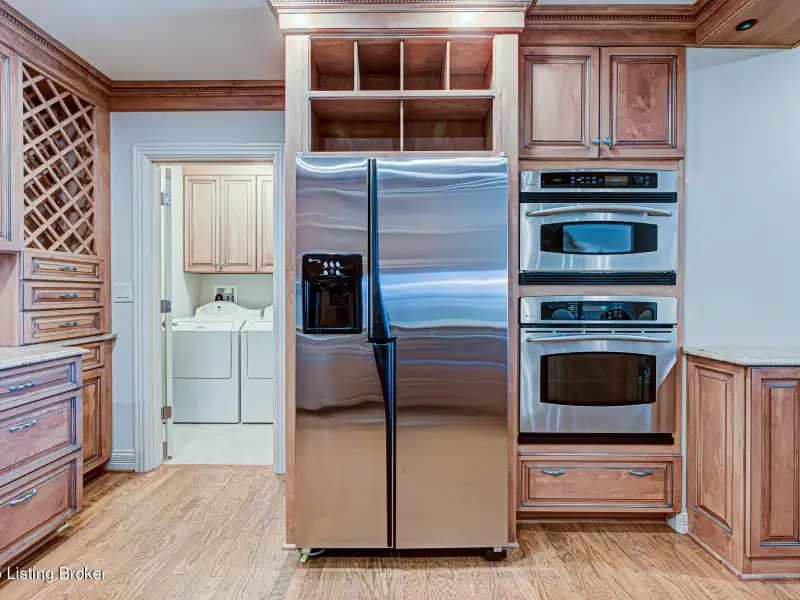 - Kitchen with custom cabinets and stainless steel appliances