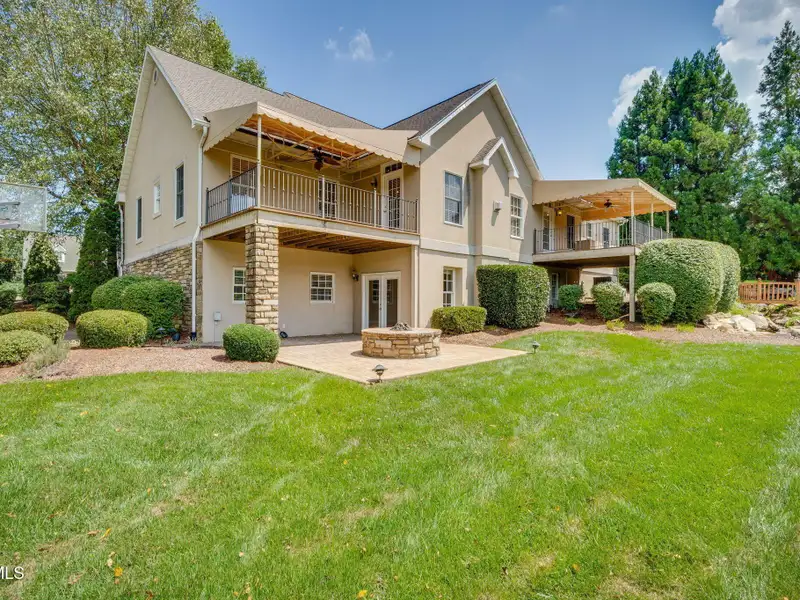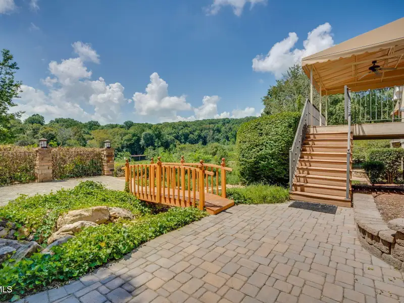 - Multiple patios with waterfalls and pond