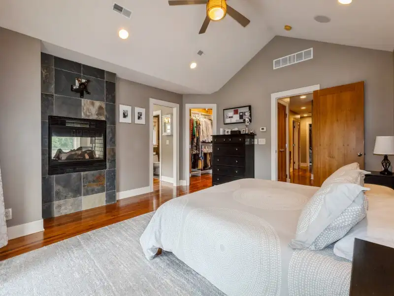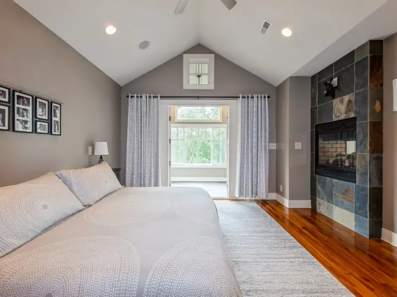 - Soaring ceilings with stone fireplace