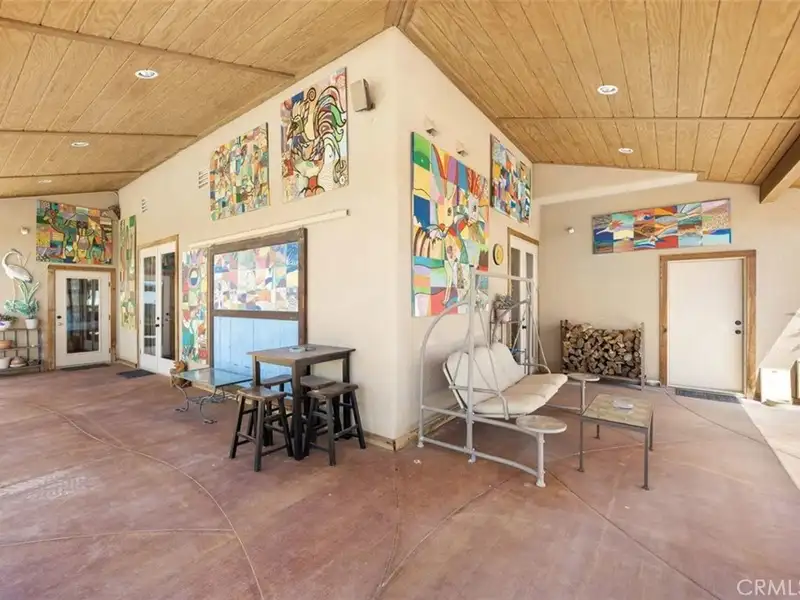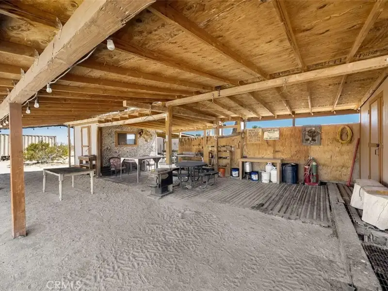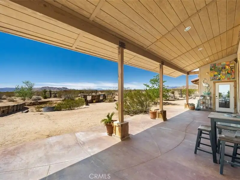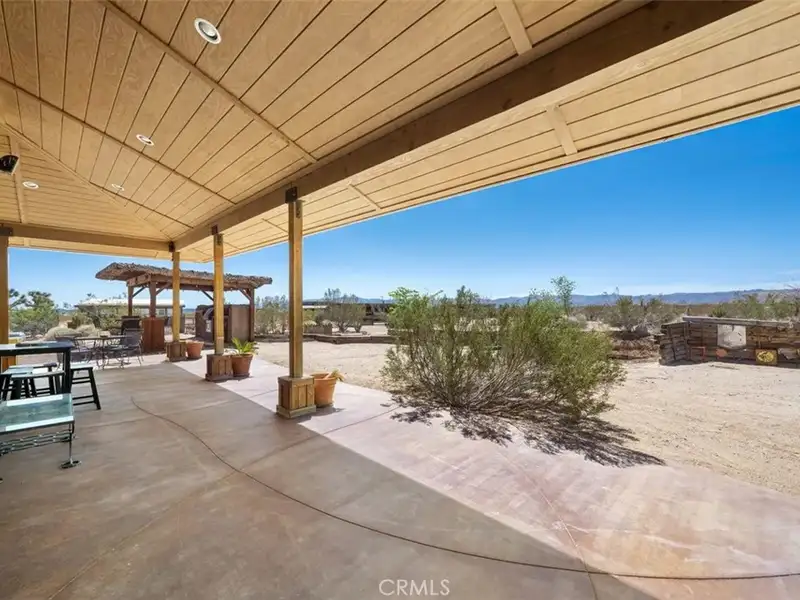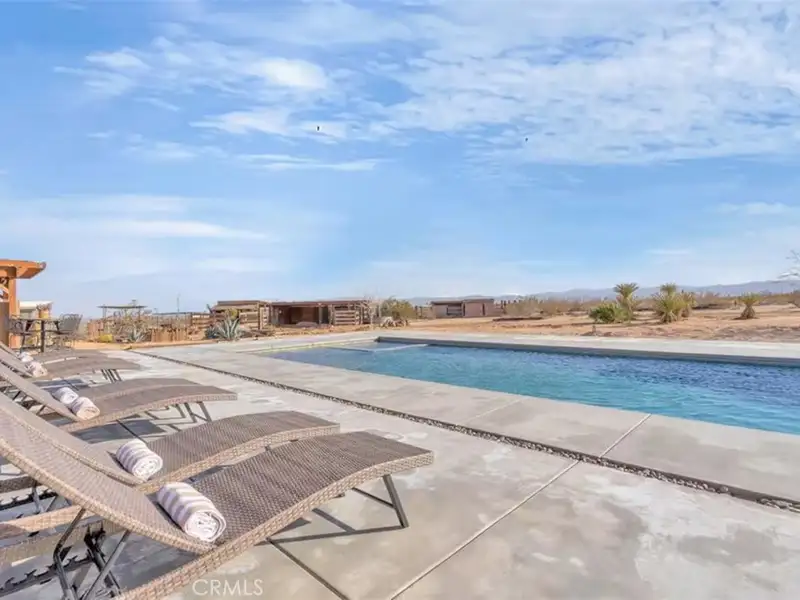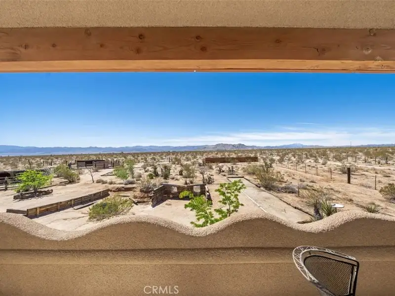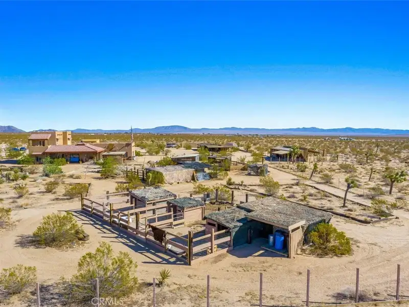 Tranquility & privacy awaits! This newly upgraded three bedroom, three bath home is located on 15 acres right in the heart of Joshua Tree. Throughout the home you'll enjoy the simple yet thoughtful touches that slowly transform your busy thoughts into a relaxed, meditative state. Conveniently located 20 minutes from Joshua Tree National Park, 13 miles from black rock nature center & 8 miles from local grocery stores. Unobstructed poolside views of Joshua Tree National Park perched on the southern horizon. Newly constructed Pebble Tec pool blends seamlessly with the landscape. This 15-acre ranch, located 20 minutes from Joshua Tree National Park and 13 miles from Black Rock Nature Center, perfectly merges luxury with the raw essence of the desert. Relax in the 50-foot pool or enjoy a tranquil evening in the 10-person spa. Pride of place is the outdoor patio, adorned with awe-inspiring artwork crafted by Master Artist Troy Bryant and 100 other local talents, ingeniously piecing together portraits of the very animals who once roamed this ranch. This outdoor space also features a barbecue area complete with ample seating, ideal for those who love to host. Nestled in its harmonious environment, you won't find a neighbor for at least 3/4 of a mile in any direction. Bask in the serene privacy of this secluded gem where you can lay under the stars unclothed if you so choose, with not a soul in sight. This desert gem sleeps 13, offers a 3 bedroom, 3 bath cheerful, sun-bathed living space fully furnished with a 3-car garage and includes multiple outdoor sheds and 2 Conex boxes for all of your storage needs. 20kWh of solar and 2 Tesla batteries provide peace of mind by eliminating the electric bill and giving seamless protection in the event of any power outages. There are 2 industrial swamp coolers designed to cool the house and mini splits in each room to bring each area to your desired comfort level. The roof deck allows for nearly 360deg views of Joshua Tree taking sunrises and sunsets to a whole new level. The 5-acre lot that adjoins the house lot has a little dirt racetrack for UTVs, dirt bikes, or ATVs, and even a 5-acre lot to the south with a paid water meter on it. The grounds are intricately lined with railroad ties from the very tracks that helped pave the West. The existing infrastructure, including water spigots at each animal pen and intact fencing, allows the new owner to easily revive the bustling ranching operation if desired.