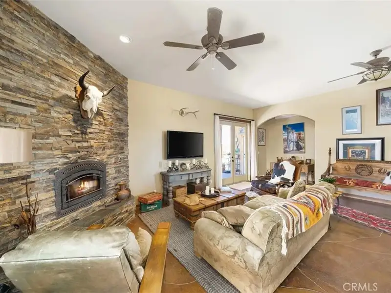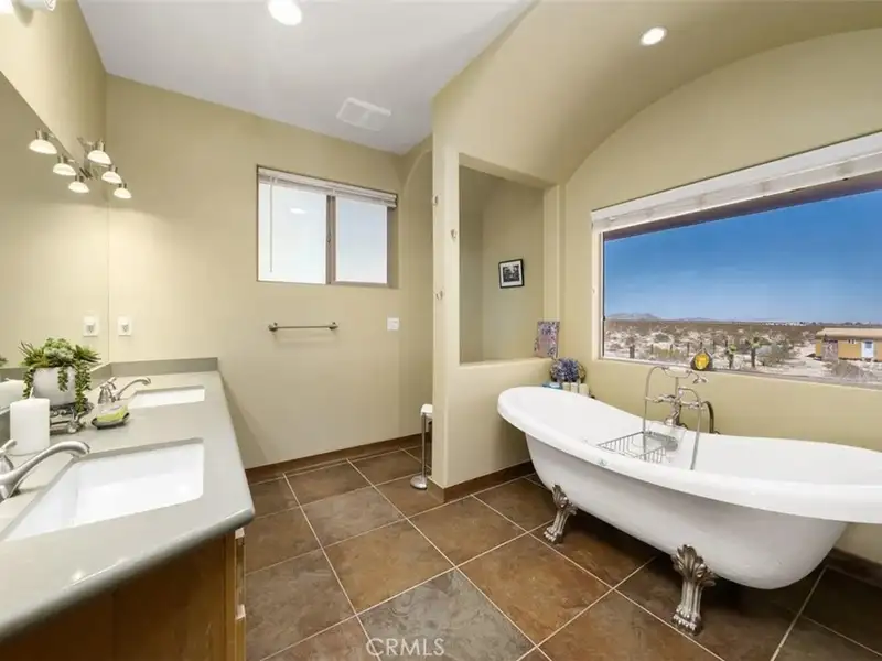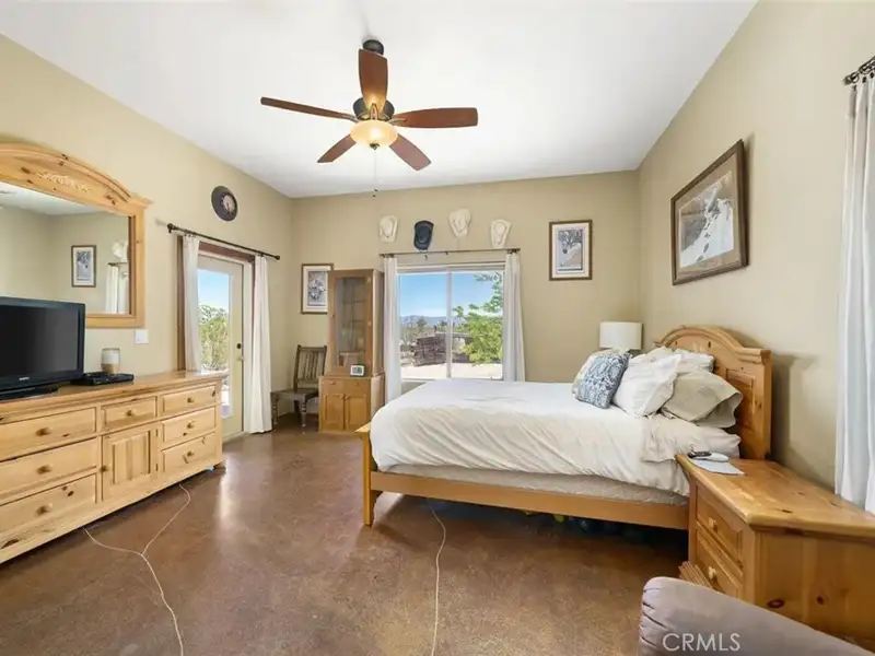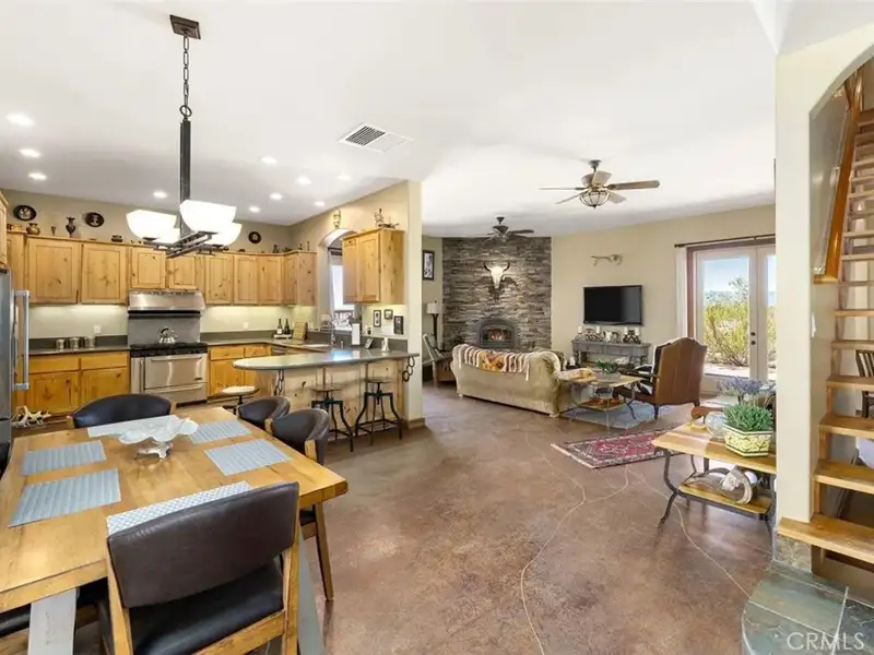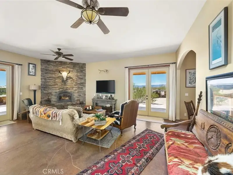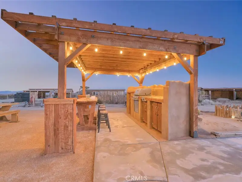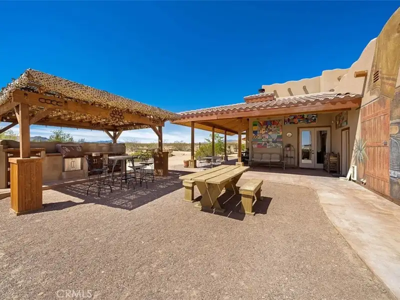 Tranquility & privacy awaits! This newly upgraded three bedroom, three bath home is located on 15 acres right in the heart of Joshua Tree. Throughout the home you'll enjoy the simple yet thoughtful touches that slowly transform your busy thoughts into a relaxed, meditative state. Conveniently located 20 minutes from Joshua Tree National Park, 13 miles from black rock nature center & 8 miles from local grocery stores. Unobstructed poolside views of Joshua Tree National Park perched on the southern horizon. Newly constructed Pebble Tec pool blends seamlessly with the landscape. This 15-acre ranch, located 20 minutes from Joshua Tree National Park and 13 miles from Black Rock Nature Center, perfectly merges luxury with the raw essence of the desert. Relax in the 50-foot pool or enjoy a tranquil evening in the 10-person spa. Pride of place is the outdoor patio, adorned with awe-inspiring artwork crafted by Master Artist Troy Bryant and 100 other local talents, ingeniously piecing together portraits of the very animals who once roamed this ranch. This outdoor space also features a barbecue area complete with ample seating, ideal for those who love to host. Nestled in its harmonious environment, you won't find a neighbor for at least 3/4 of a mile in any direction. Bask in the serene privacy of this secluded gem where you can lay under the stars unclothed if you so choose, with not a soul in sight. This desert gem sleeps 13, offers a 3 bedroom, 3 bath cheerful, sun-bathed living space fully furnished with a 3-car garage and includes multiple outdoor sheds and 2 Conex boxes for all of your storage needs. 20kWh of solar and 2 Tesla batteries provide peace of mind by eliminating the electric bill and giving seamless protection in the event of any power outages. There are 2 industrial swamp coolers designed to cool the house and mini splits in each room to bring each area to your desired comfort level. The roof deck allows for nearly 360deg views of Joshua Tree taking sunrises and sunsets to a whole new level. The 5-acre lot that adjoins the house lot has a little dirt racetrack for UTVs, dirt bikes, or ATVs, and even a 5-acre lot to the south with a paid water meter on it. The grounds are intricately lined with railroad ties from the very tracks that helped pave the West. The existing infrastructure, including water spigots at each animal pen and intact fencing, allows the new owner to easily revive the bustling ranching operation if desired.