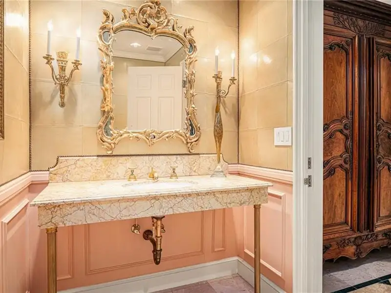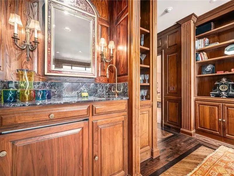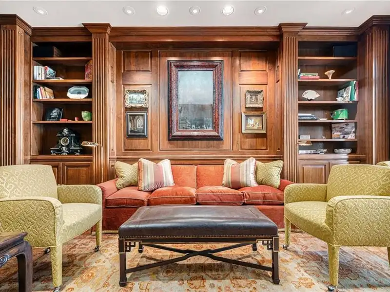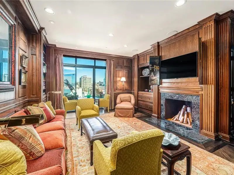 • Wood-paneled library with marble fireplace