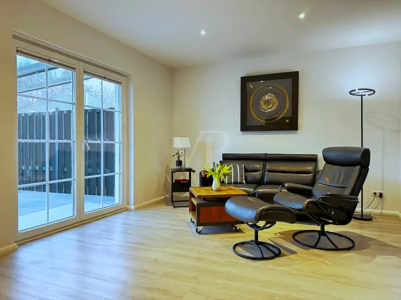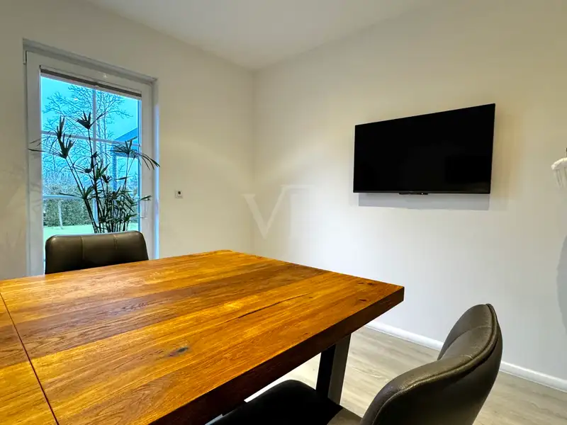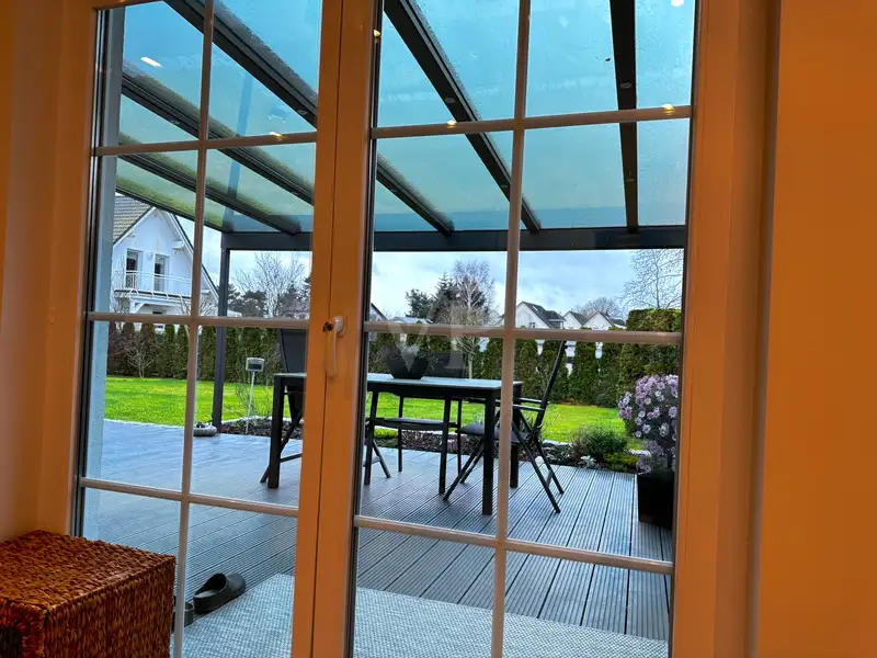 The heart of the property is the bright and friendly living room, which also offers direct access to the terrace and garden. These areas are ideal for family gatherings or sociable evenings with friends. The terrace is partially covered with a UV-impermeable glass roof, which was built in 2023 and thus offers protection in different weather conditions.