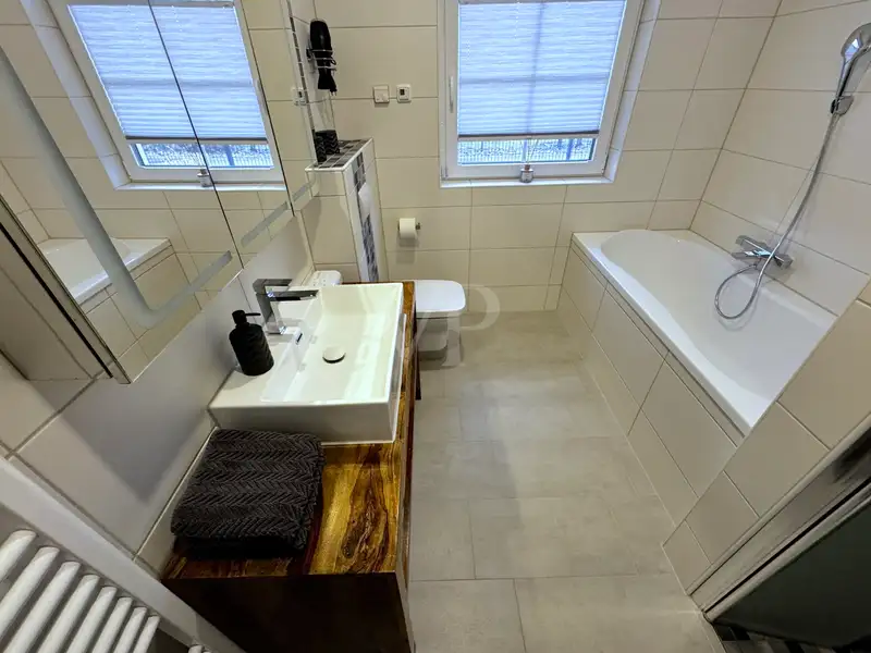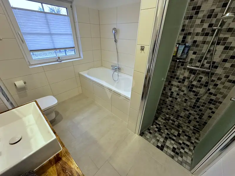 The daylight bathroom boasts a bathtub and a walk-in shower and was also modernized in 2022. There is also a separate guest WC, which is particularly practical for visitors.