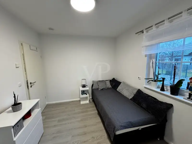 The house has a living space of approx. 94 m² and offers a total of five rooms, three of which are spacious bedrooms. Two of these bedrooms have direct access to the spacious terrace and the sunny garden, which offers additional comfort and privacy. It is also possible to convert one of the bedrooms into an office, allowing flexibility for individual living concepts.