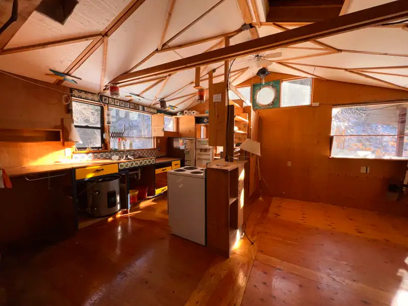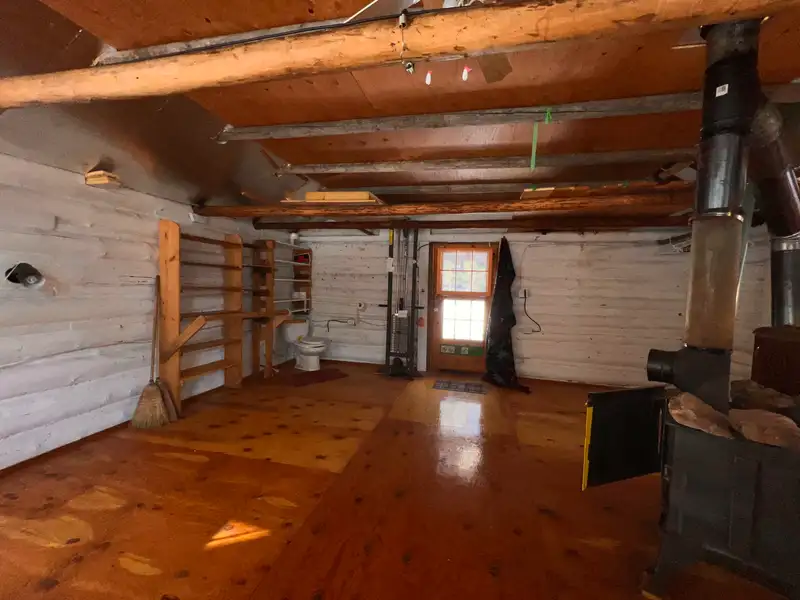- Rustic log cabin nestled in trees