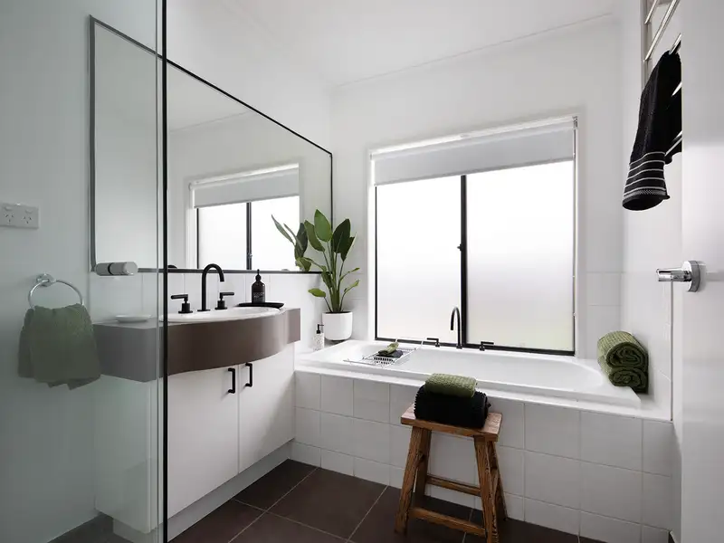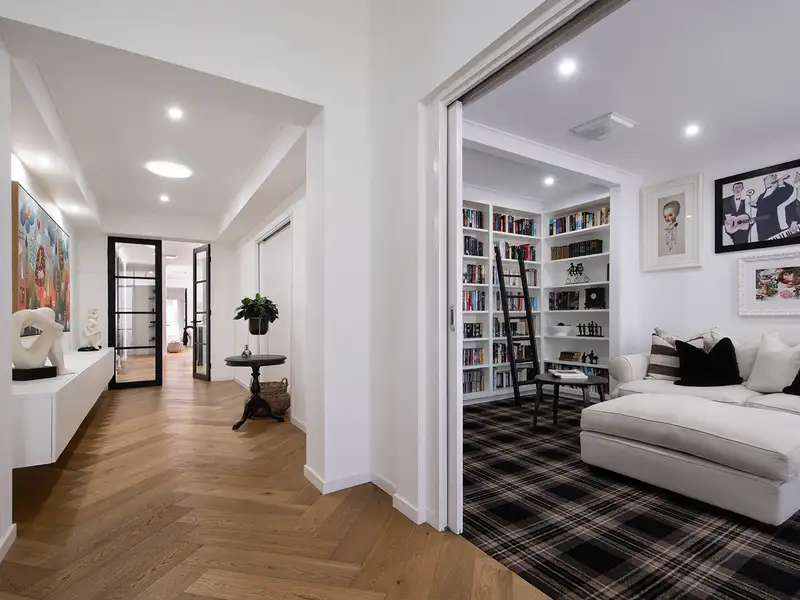 • A welcoming entryway introduces the home, with the luxurious main suite to one side featuring a spacious walk-in robe and ensuite, and a dedicated library or flexible living room to the other.