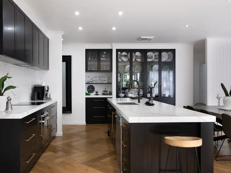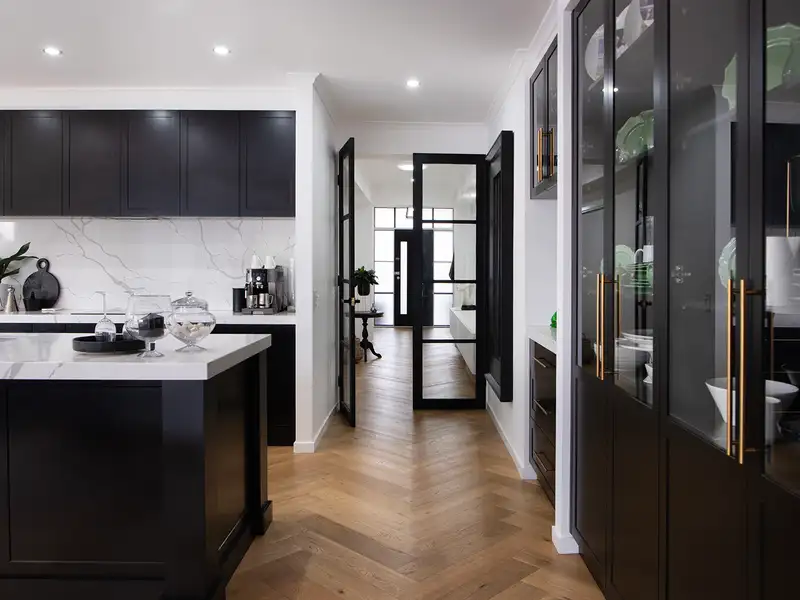 • The kitchen is a true highlight, showcasing marble-look benchtops and splashback, moody dark cabinetry, an induction cooktop, dishwasher, and a huge butler's pantry with masses of storage.