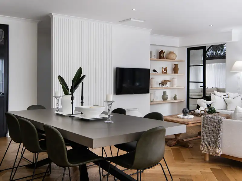• On-trend interiors are enhanced with gorgeous herringbone flooring, custom wall panelling, and a light-filled dining bay window that adds character and charm.