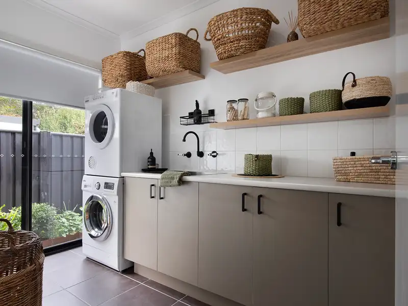 • Generous storage is provided throughout, including a walk-in linen press, laundry with cabinetry, and built-in shelving.