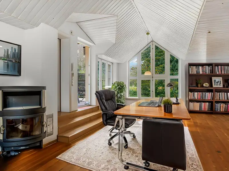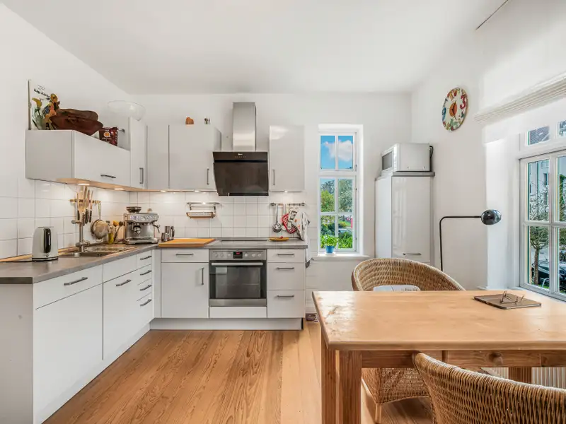 The main house impresses with its high ceilings, large window fronts and the warm character of the original wooden floorboards. An open kitchen area and a stylish fireplace room on the first floor create an inviting ambience. From here you can access one of the balconies and the spacious terraces, which invite you to linger and enjoy the outdoors.