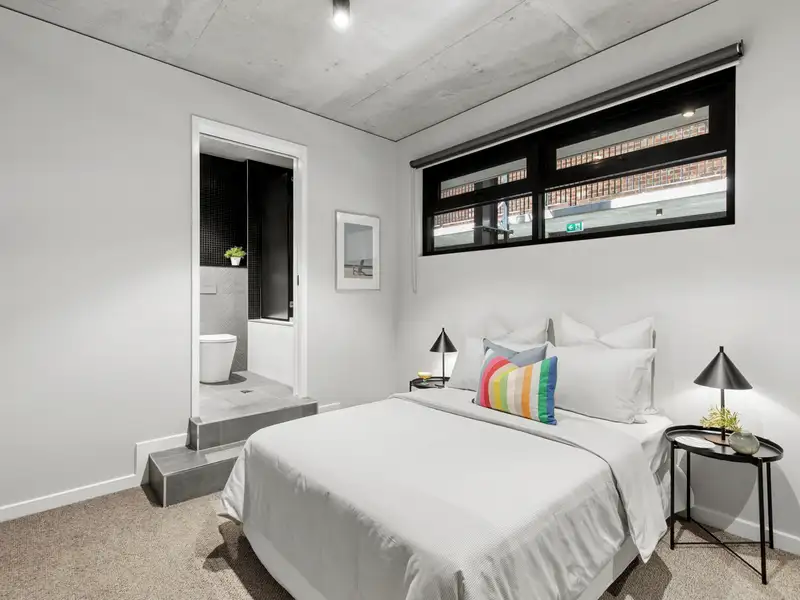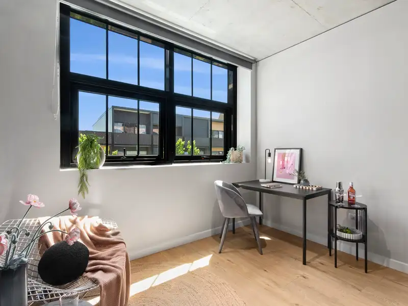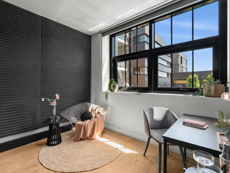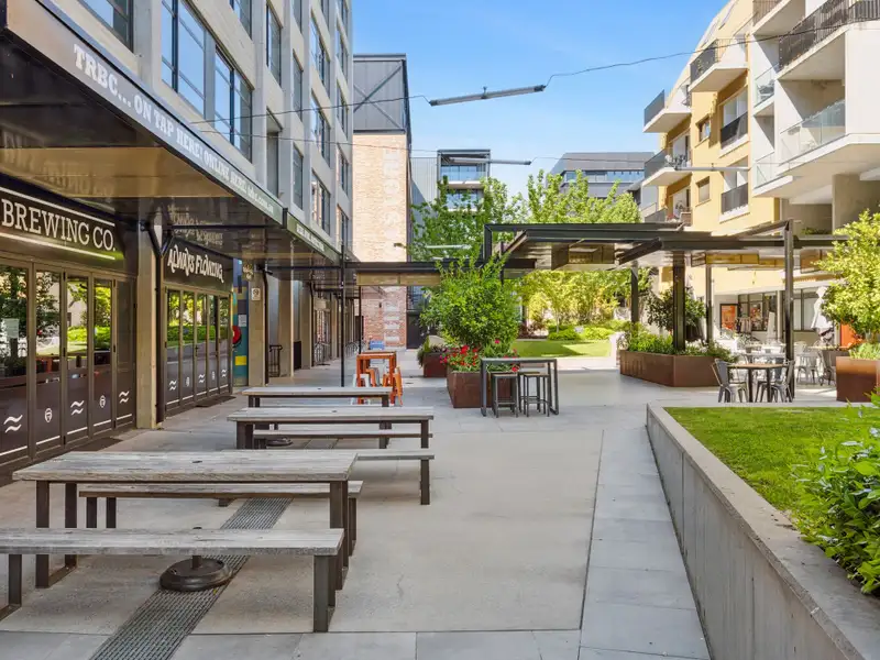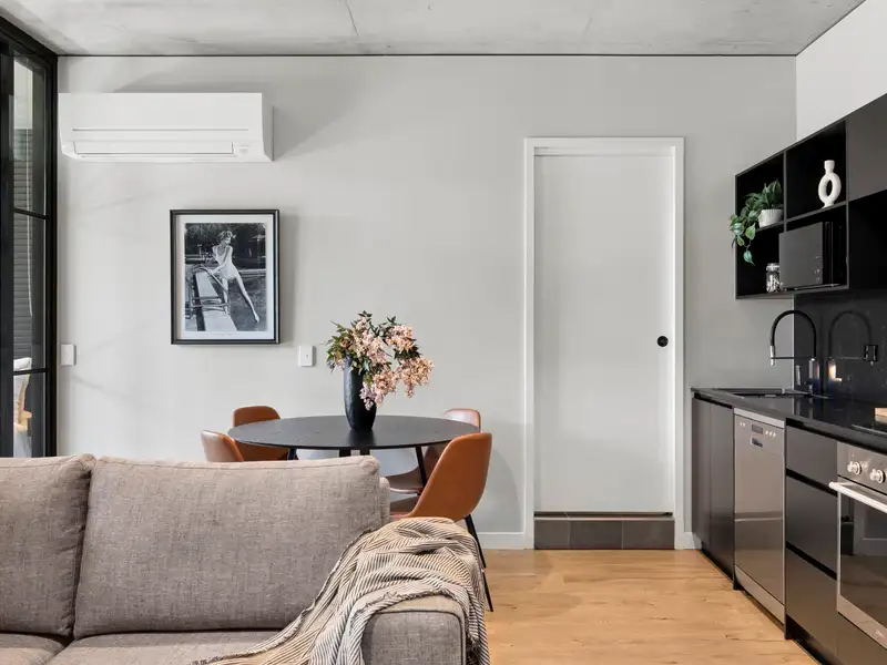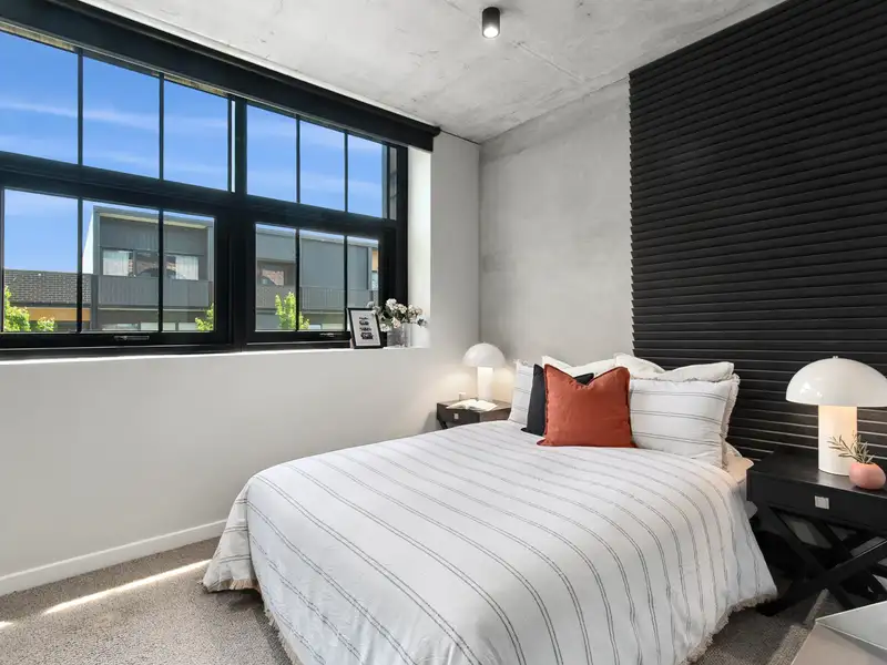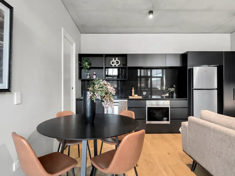 Nestled in the vibrant and desirable Kingsborough Village precinct of Kingston, this stylish two-bedroom apartment delivers a compelling blend of convenience and character. Located just moments from the foreshore, lakeside walks, cafés and boutique shops, you'll enjoy the best of Inner-South living at your doorstep. Inside, the open-plan living and dining zone is enhanced by industrial chic design elements-exposed raw concrete walls, shadow-line ceilings and oak-engineered timber floors-creating a stunning backdrop for entertaining. The sleek chef's kitchen doesn't disappoint, featuring premium Italian ILVE appliances (including induction cooktop), stone benchtops and clean, modern finishes that combine form and function effortlessly.