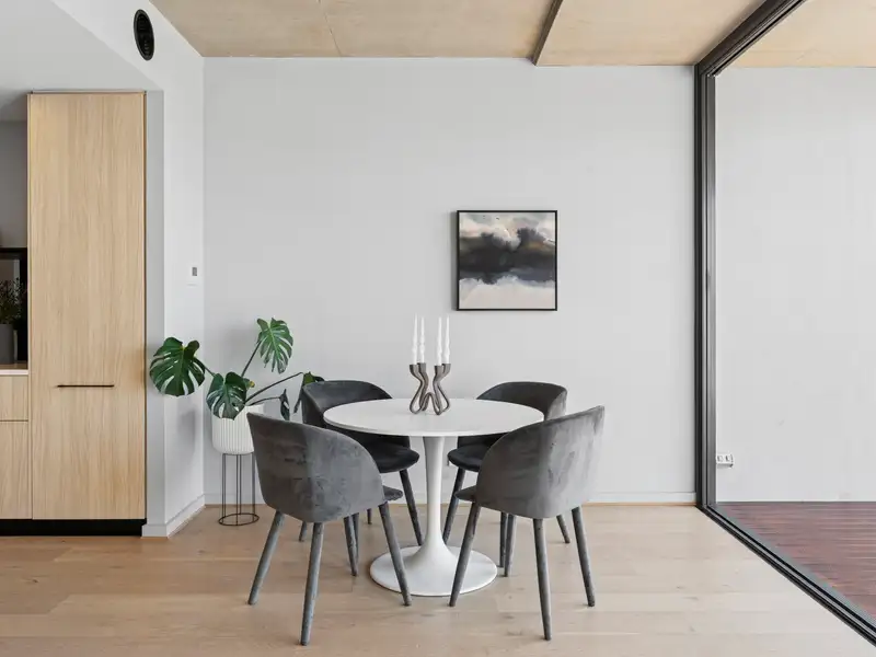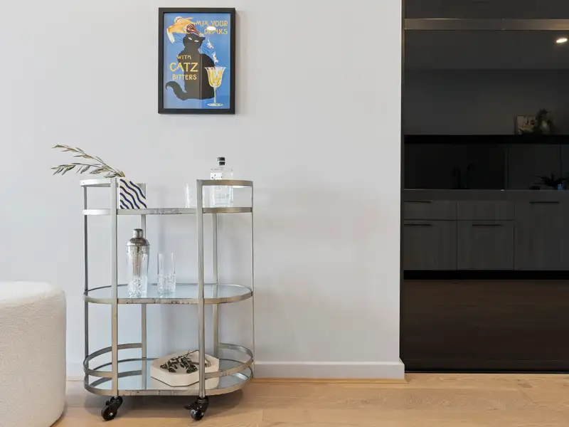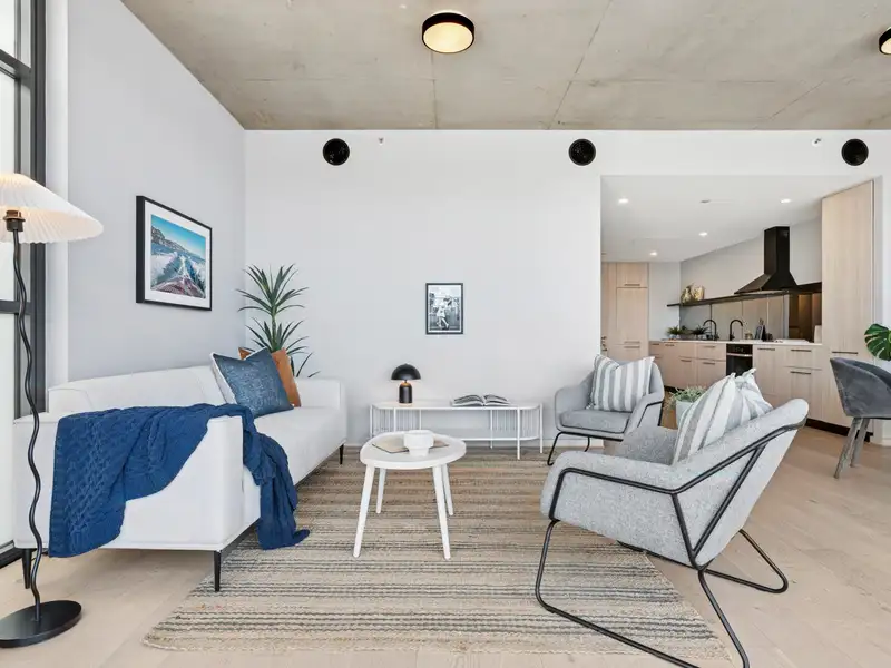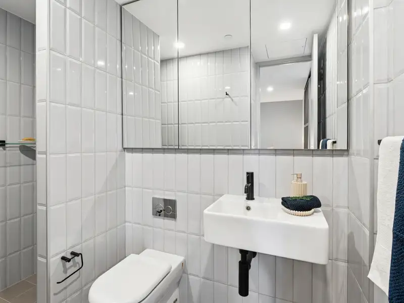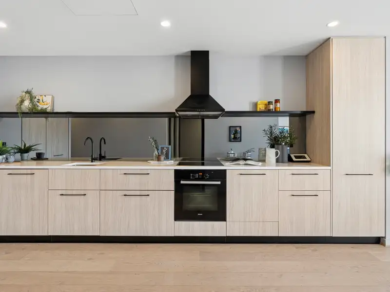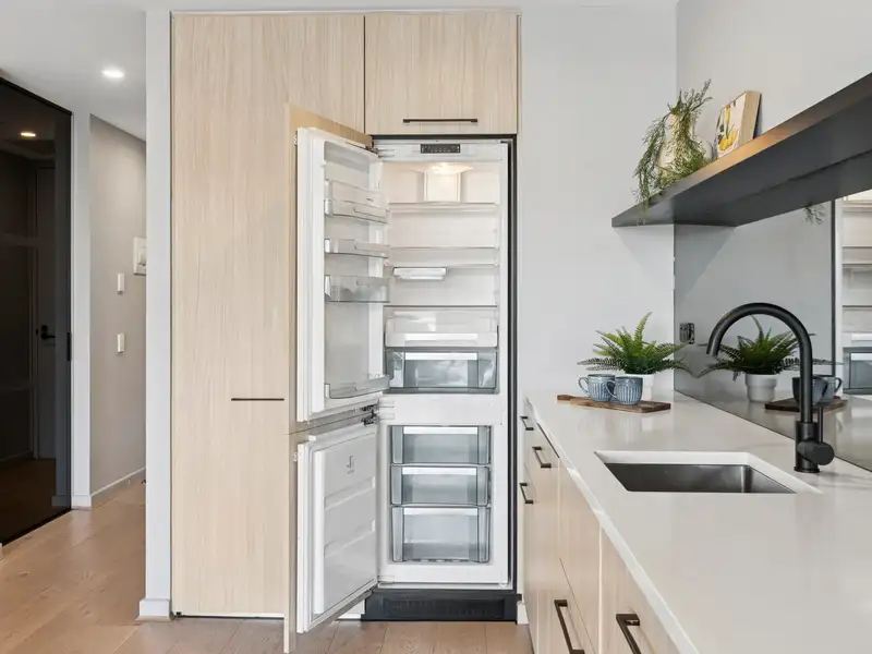 Designed for modern living, the open-plan layout features engineered timber floors, a sleek Miele-appointed kitchen with integrated fridge and dishwasher, and full-height glass doors opening to a spacious balcony overlooking the lake and parklands.