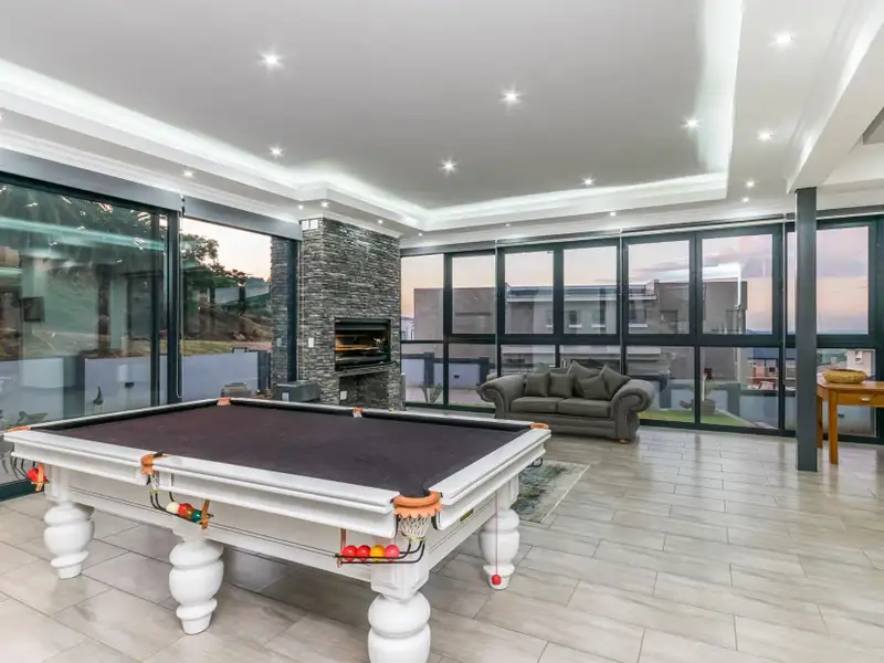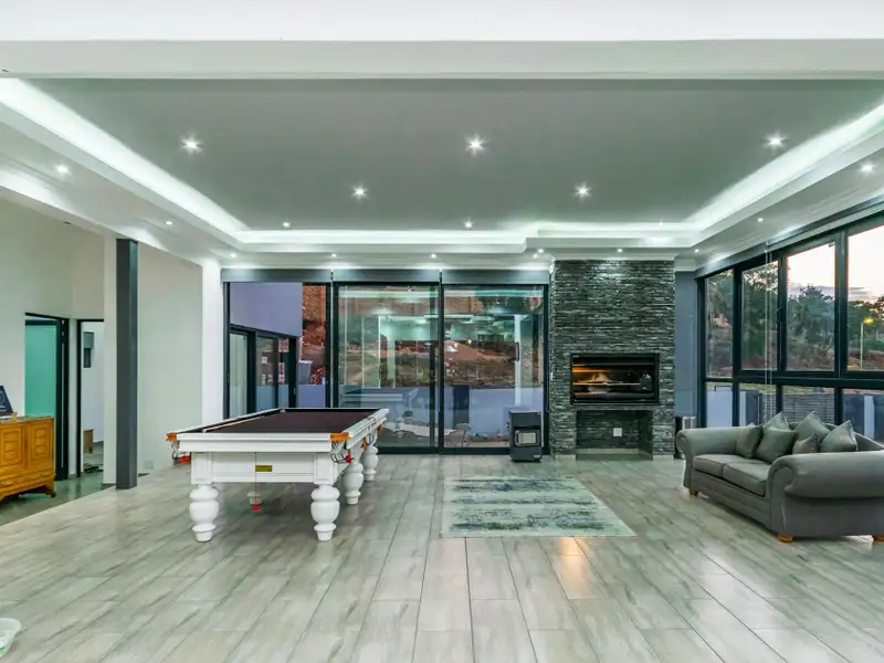 Open plan to TV room/casual lounge area. All windows are Aluminum stack away frames. Open plan dining area and large inside entertainment lounge area, with built in braai, ample space to entertain in style. Leads onto pool area and large double size stand with beautiful lawns.