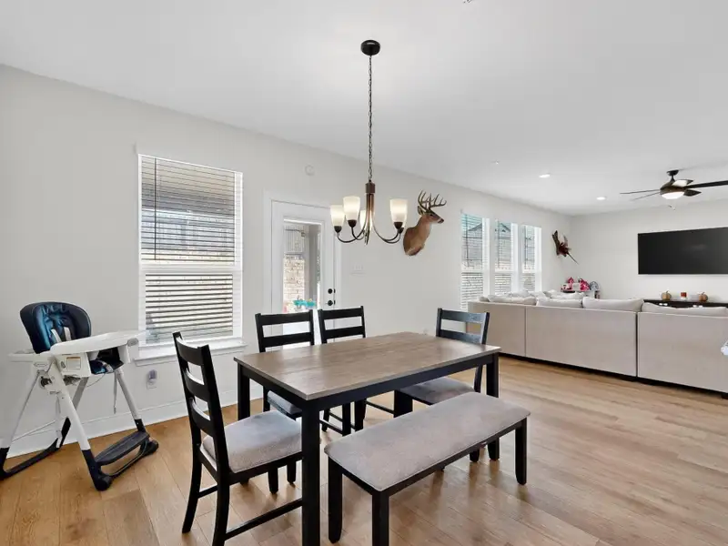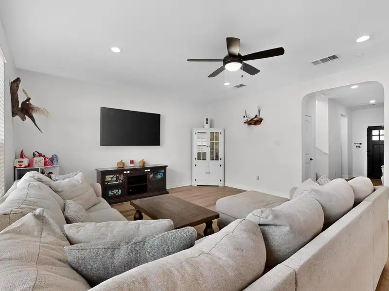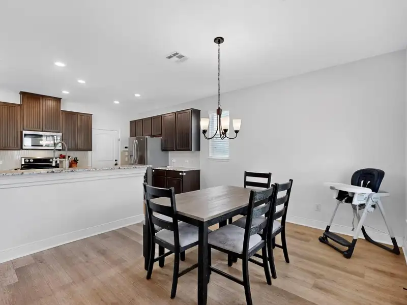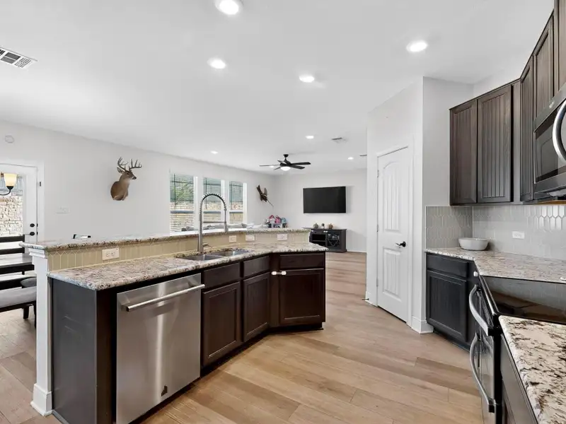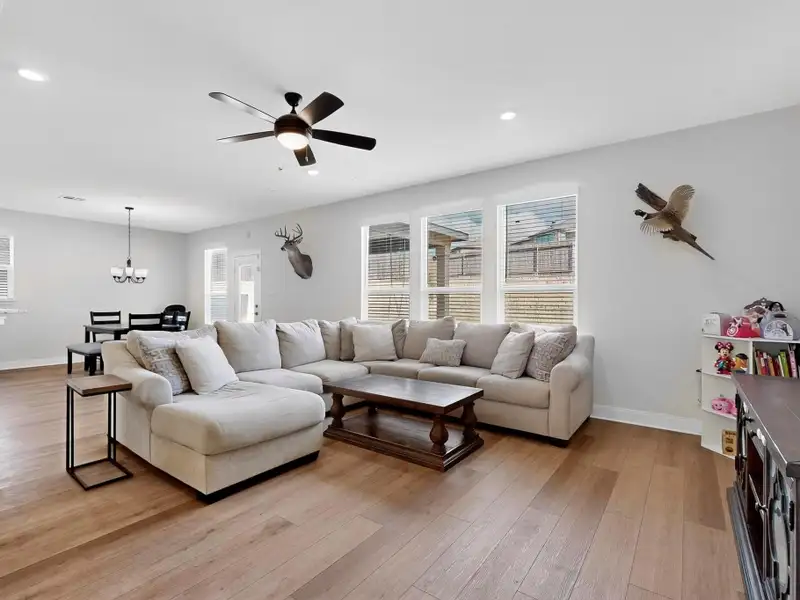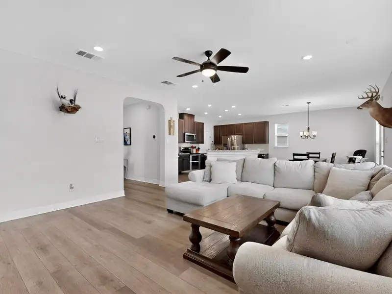 - Open-concept kitchen, dining, living area