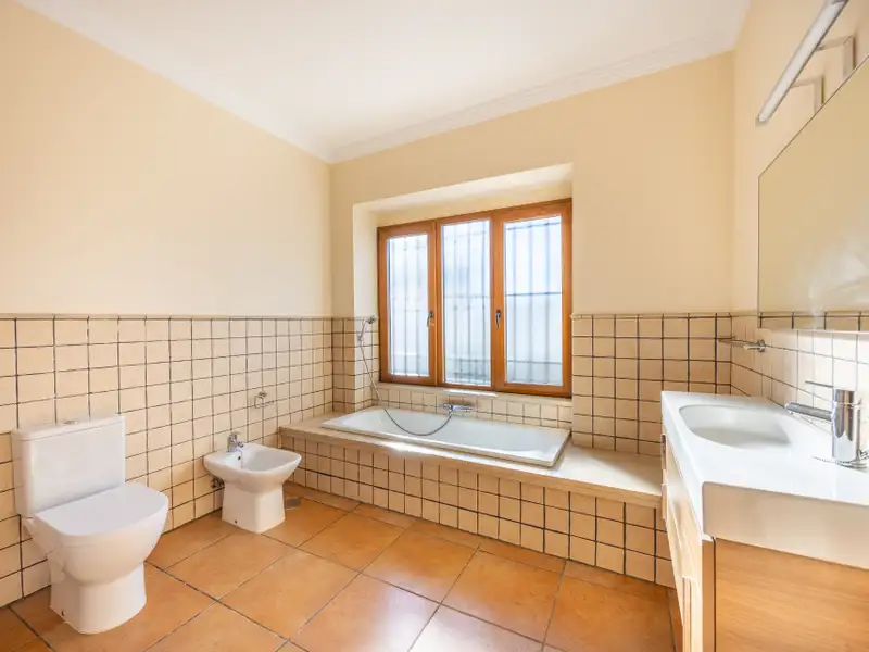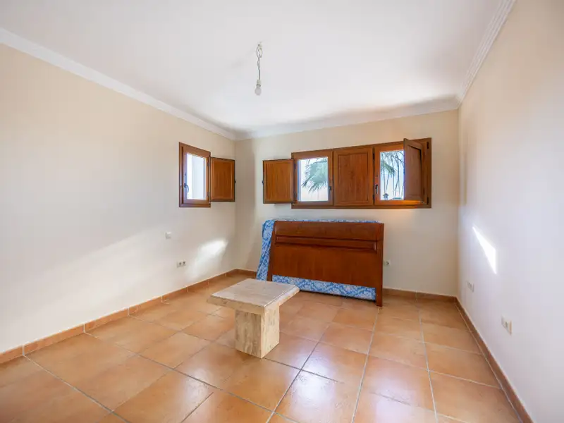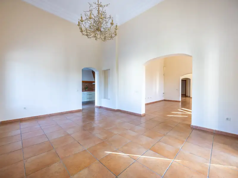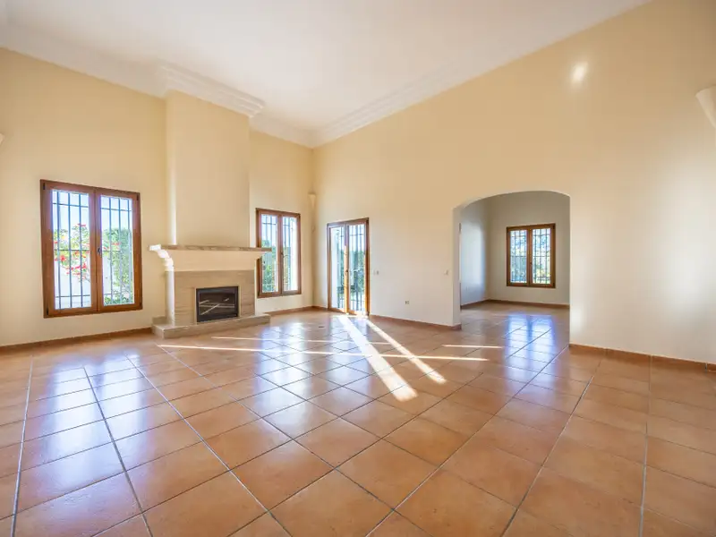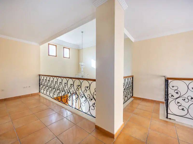 The villa, distributed over two floors, boasts three bedrooms—two on the ground floor and a suite on the first floor—and a total of four bathrooms (one of them by the pool), providing generous and functional living space. On the main floor, a stylish double-height entrance hall welcomes you, enhanced by an impressive chandelier and high ceilings. On one side, there are two bedrooms with built-in wardrobes and two bathrooms, one of them en-suite, offering privacy and comfort. On the other side, you’ll find a spacious living room with a fireplace, a separate dining room that could be converted into a playroom or study, connected to a fully equipped kitchen with an adjoining laundry area. On the upper floor, there is a third bedroom with an adjacent bathroom, ideal as a master or guest room.