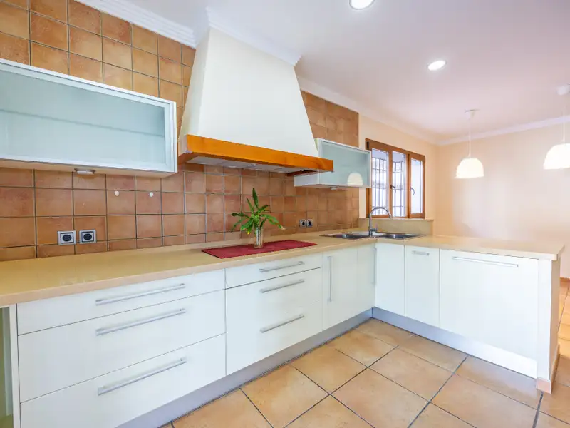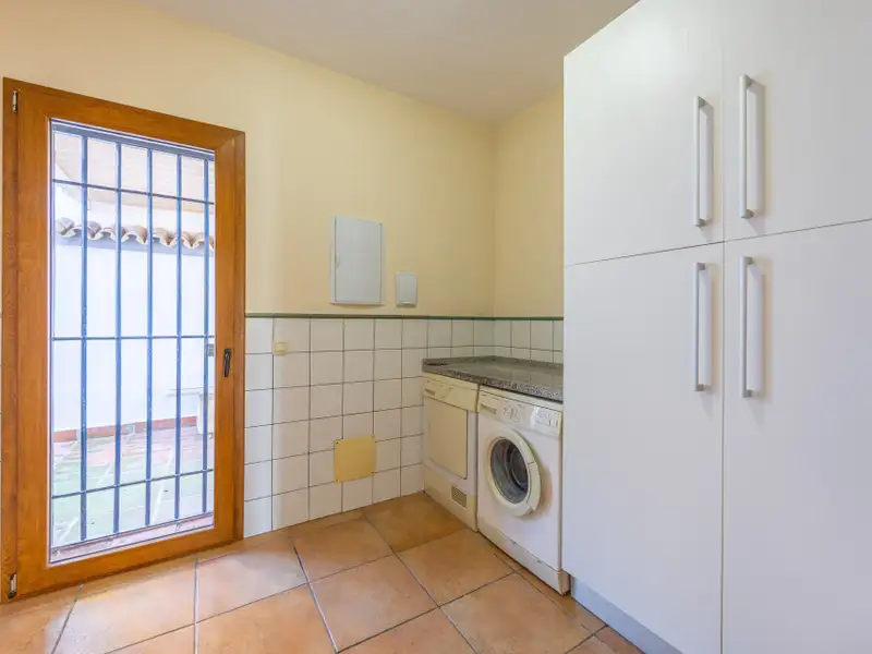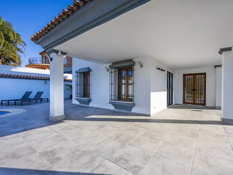The exterior of the property is equally impressive, featuring a well-maintained and recently renovated private garden surrounding a 46 m² swimming pool. The covered porch area invites you to enjoy the Mediterranean climate year-round, while a practical laundry area, storage room, and an additional bathroom by the pool add to the outdoor functionality. The property also offers a parking area, including covered space for two vehicles and uncovered space for two more—perfect for families with multiple transportation needs.