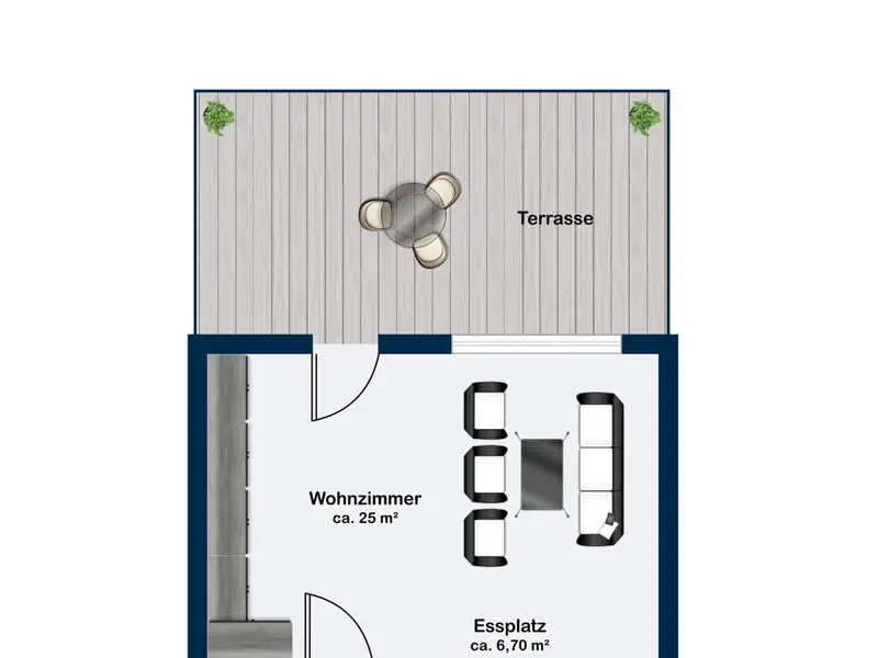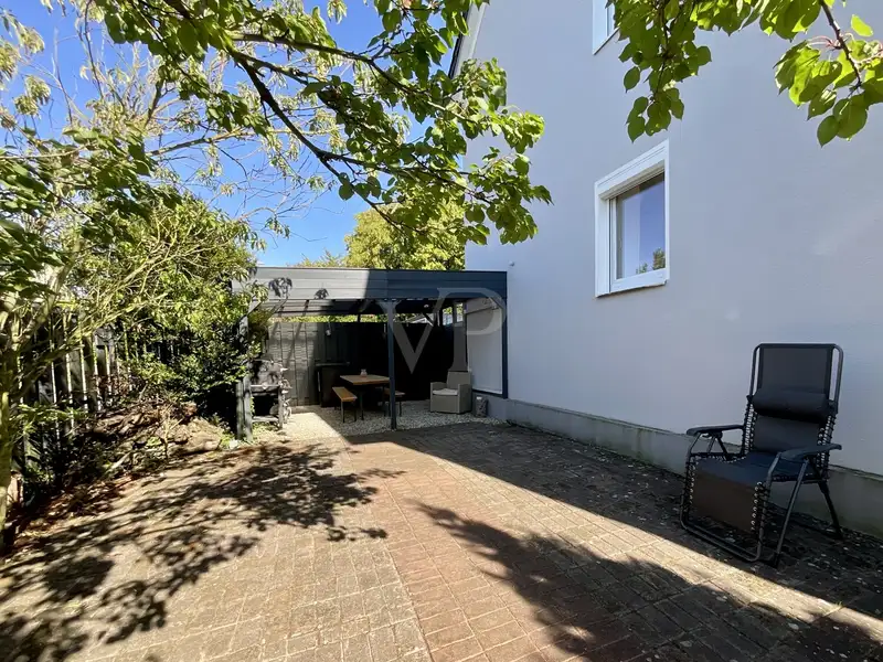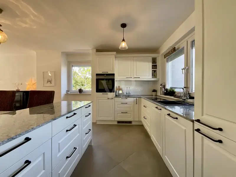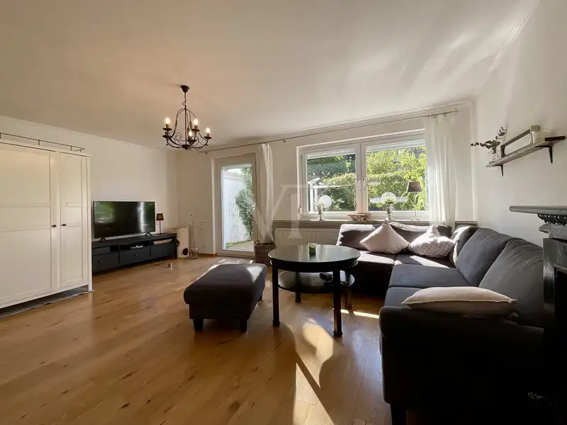 The heart of the house is the spacious living area, which extends over the entire width of the house of approx. 6.5 m. At approx. 32 m², it offers enough space to set up a dining area and a sofa corner - the perfect setting for socializing with family and friends. The living area flows seamlessly into the adjoining kitchen, with only a work counter providing a visual separation between the living zones, so that the requirements of modern, open-plan living are met. The kitchen, which is fitted with white units and an anthracite-coloured granite worktop, will delight you, as it harmonizes perfectly with the dark tiles and the real wood parquet flooring in the living room.